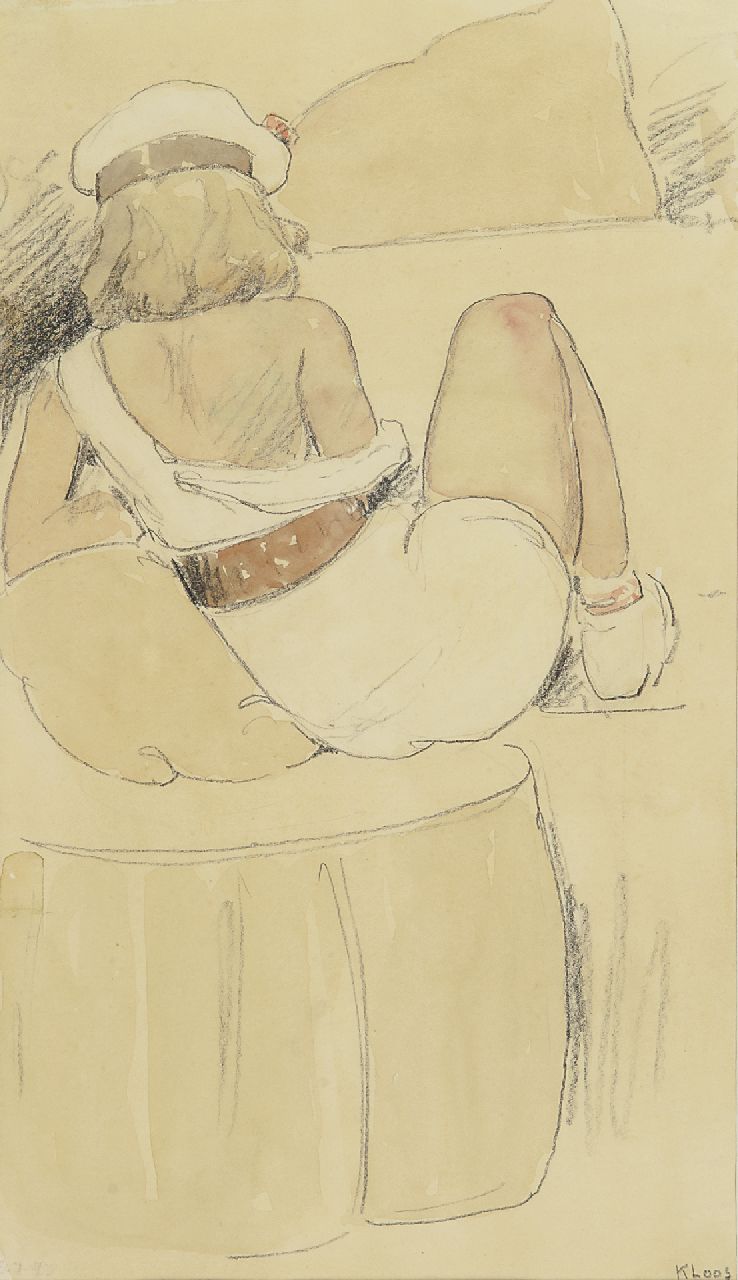 Cornelis Kloos kunstwerk • aquarel • tekening • voorheen te koop Zittende vrouw met witte jurk en baret