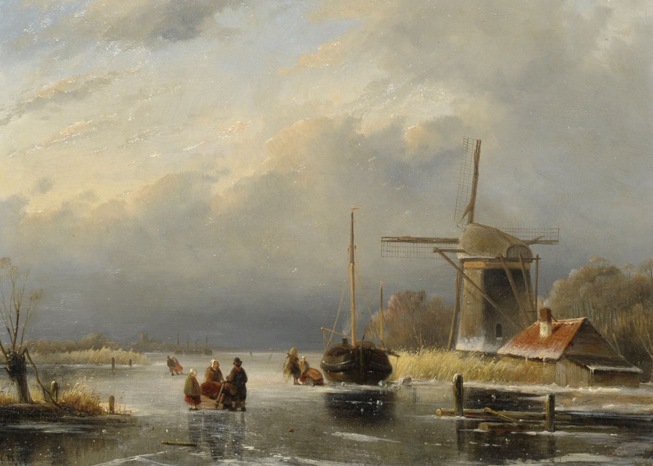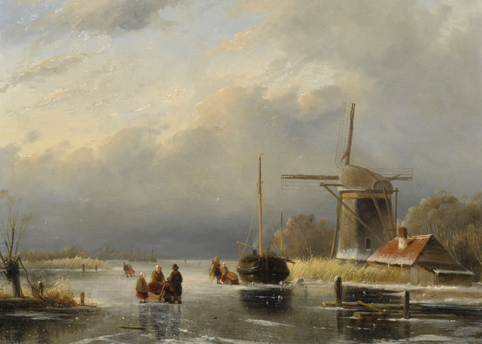 Cornelis Petrus 't Hoen kunstwerk • schilderij • voorheen te koop Winterlandschap met schaatsers bij een molen