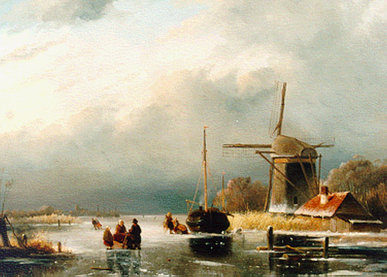Cornelis Petrus 't Hoen kunstwerk • schilderij • voorheen te koop Winterlandschap met schaatsers bij een molen