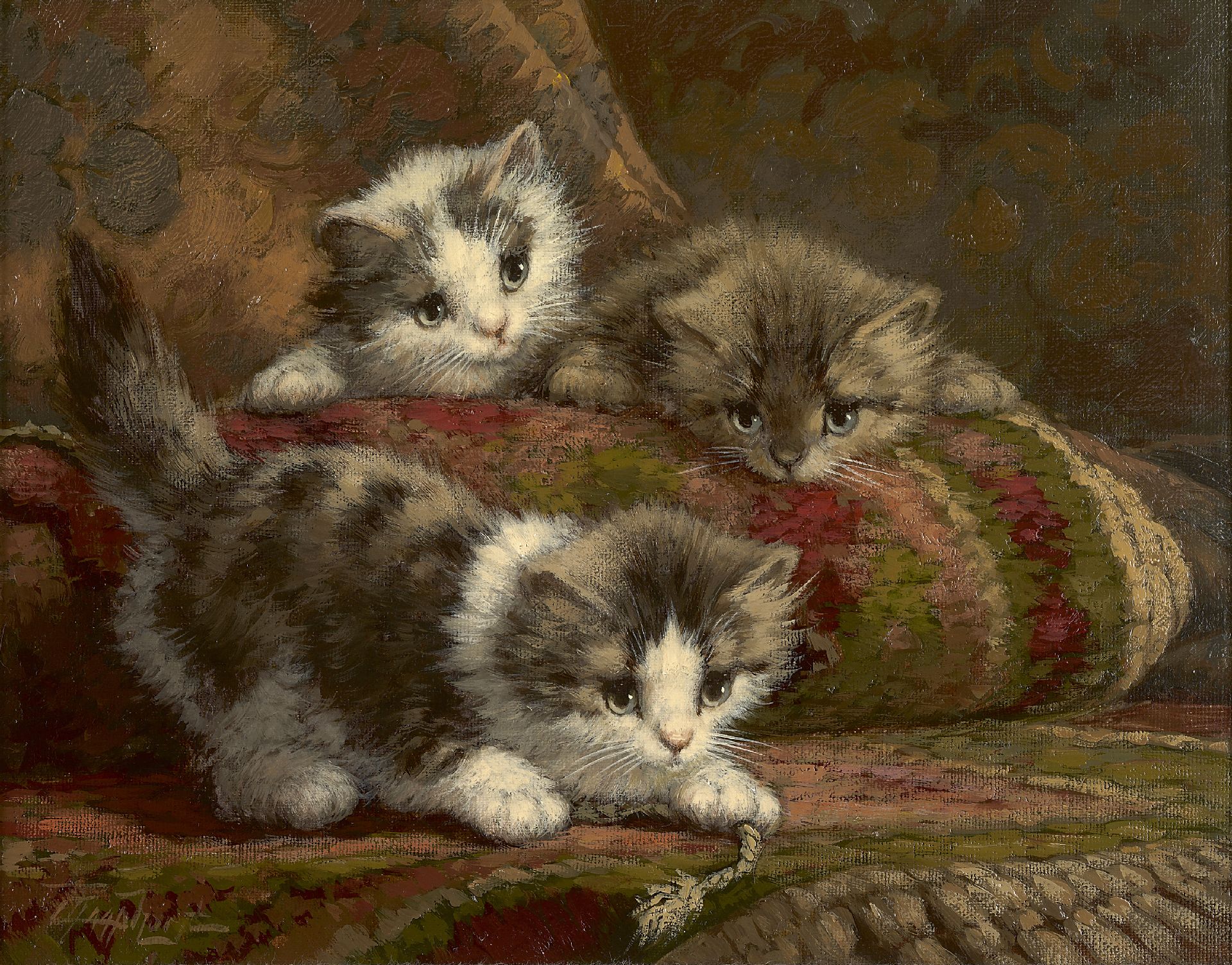 Cornelis Raaphorst kunstwerk • schilderij • voorheen te koop Drie katjes op een sierkussen