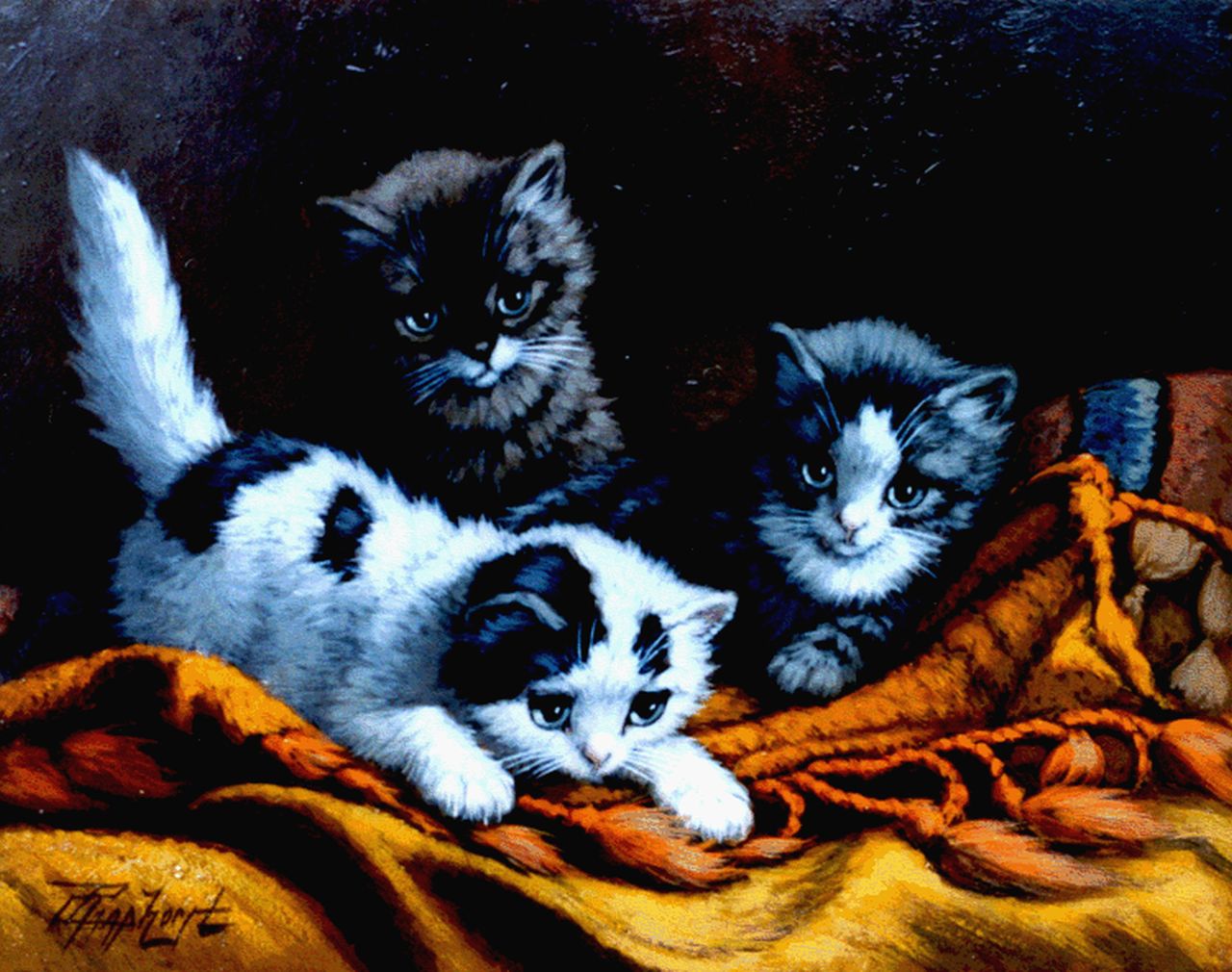 Cornelis Raaphorst kunstwerk • schilderij • voorheen te koop Drie poesjes op een Turks kussen