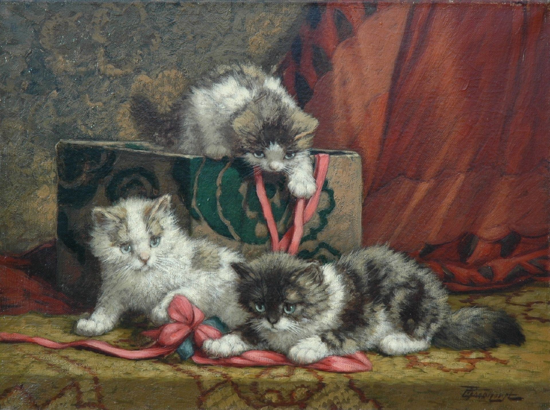Cornelis Raaphorst kunstwerk • schilderij • voorheen te koop Drie spelende kittens bij een lintendoos
