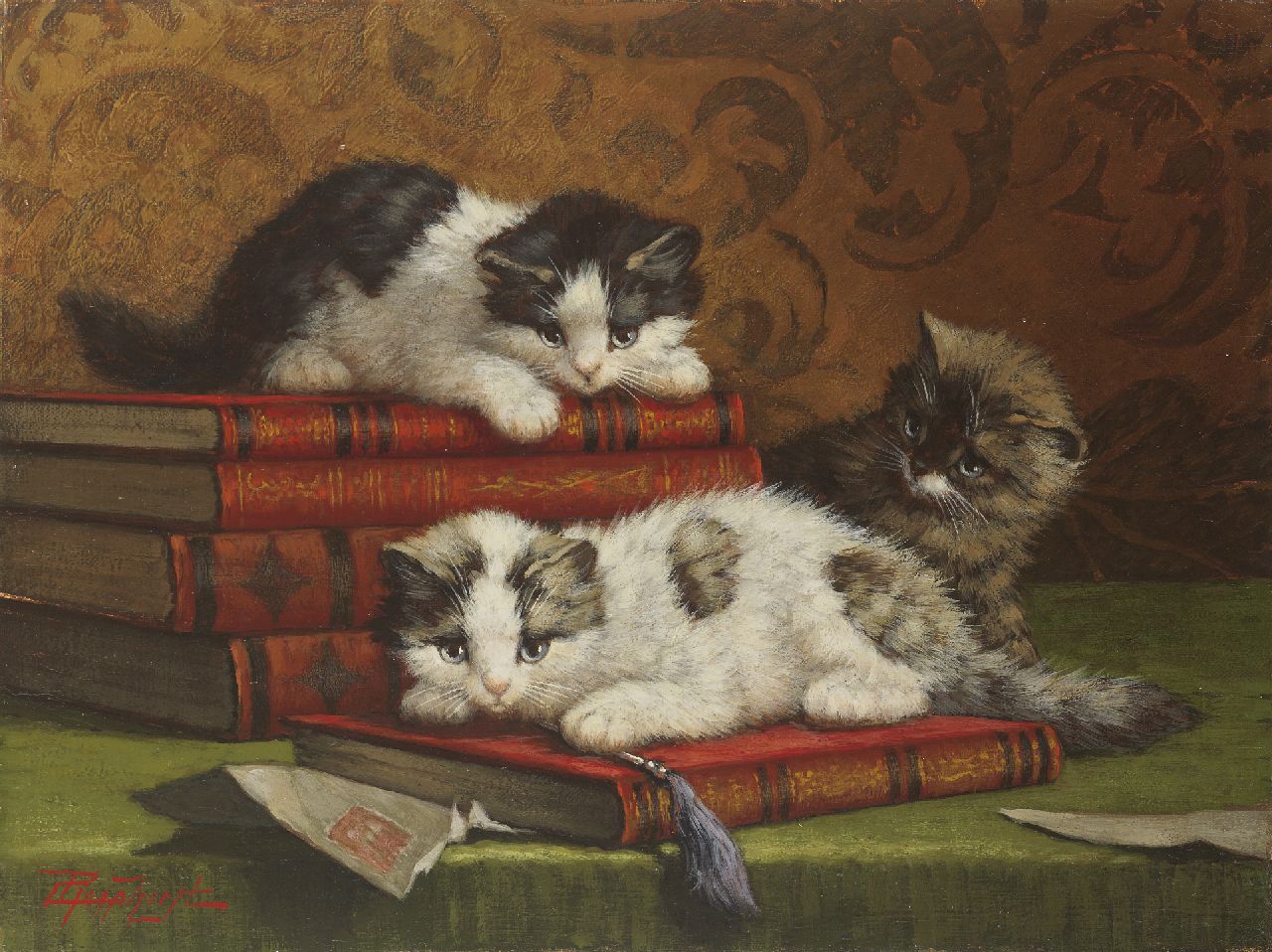 Cornelis Raaphorst kunstwerk • schilderij • voorheen te koop Drie spelende poesjes bij een stapel boeken