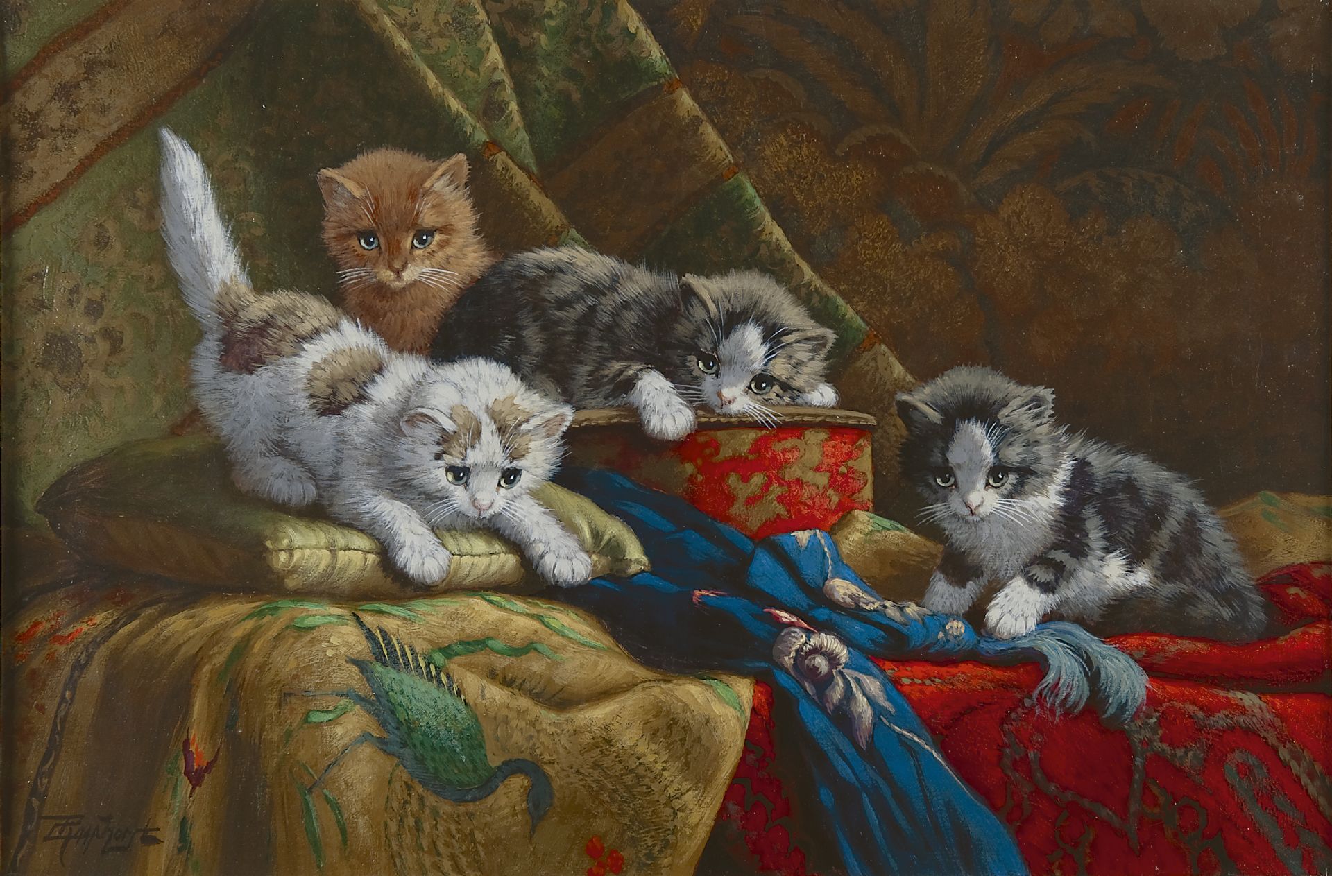 Cornelis Raaphorst | Drie spelende katjes bij een poef, olieverf op doek, 40,4 x 50,7 cm, gesigneerd l.o. en zonder lijst