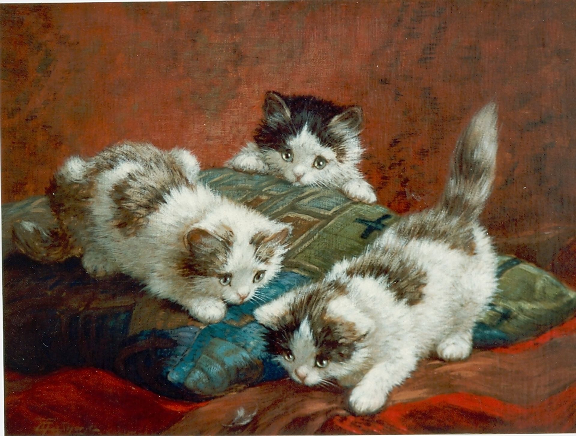 Cornelis Raaphorst kunstwerk • schilderij • voorheen te koop Spelende poesjes op een kussen