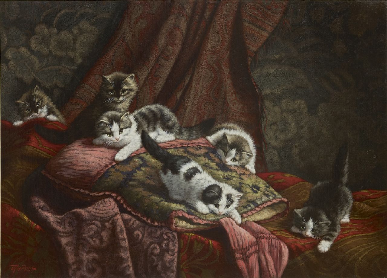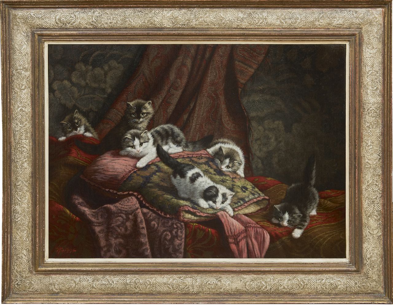 Cornelis Raaphorst kunstwerk • schilderij • voorheen te koop Zes kittens spelend in een interieur