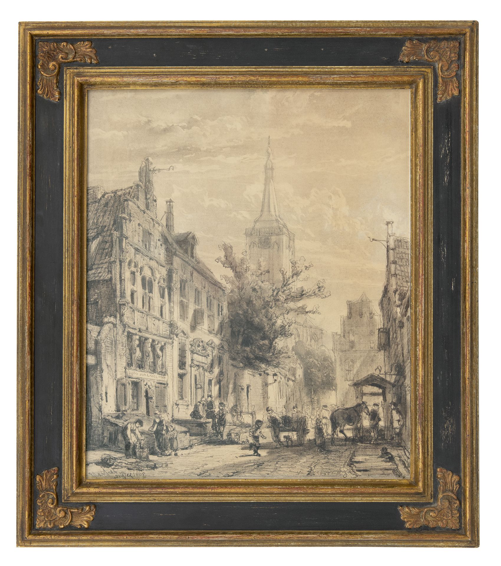 Cornelis Springer kunstwerk • aquarel • tekening • te koop Gezicht op de Nieuwstraat in Hasselt, Overijssel