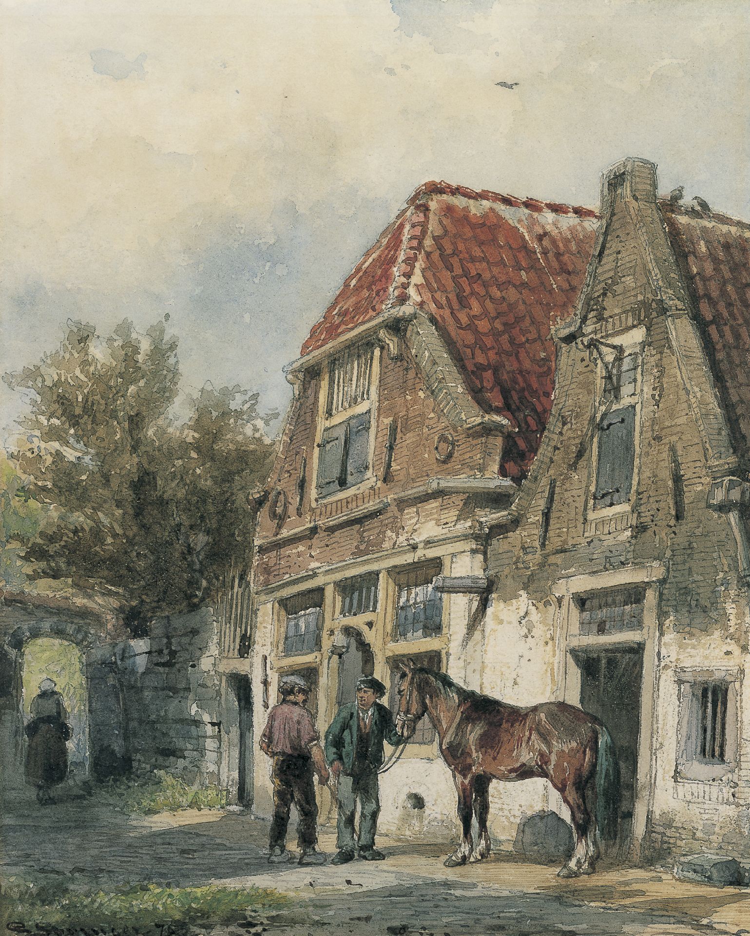 Cornelis Springer kunstwerk • aquarel • tekening • voorheen te koop Stalknechten met paard in een straatje