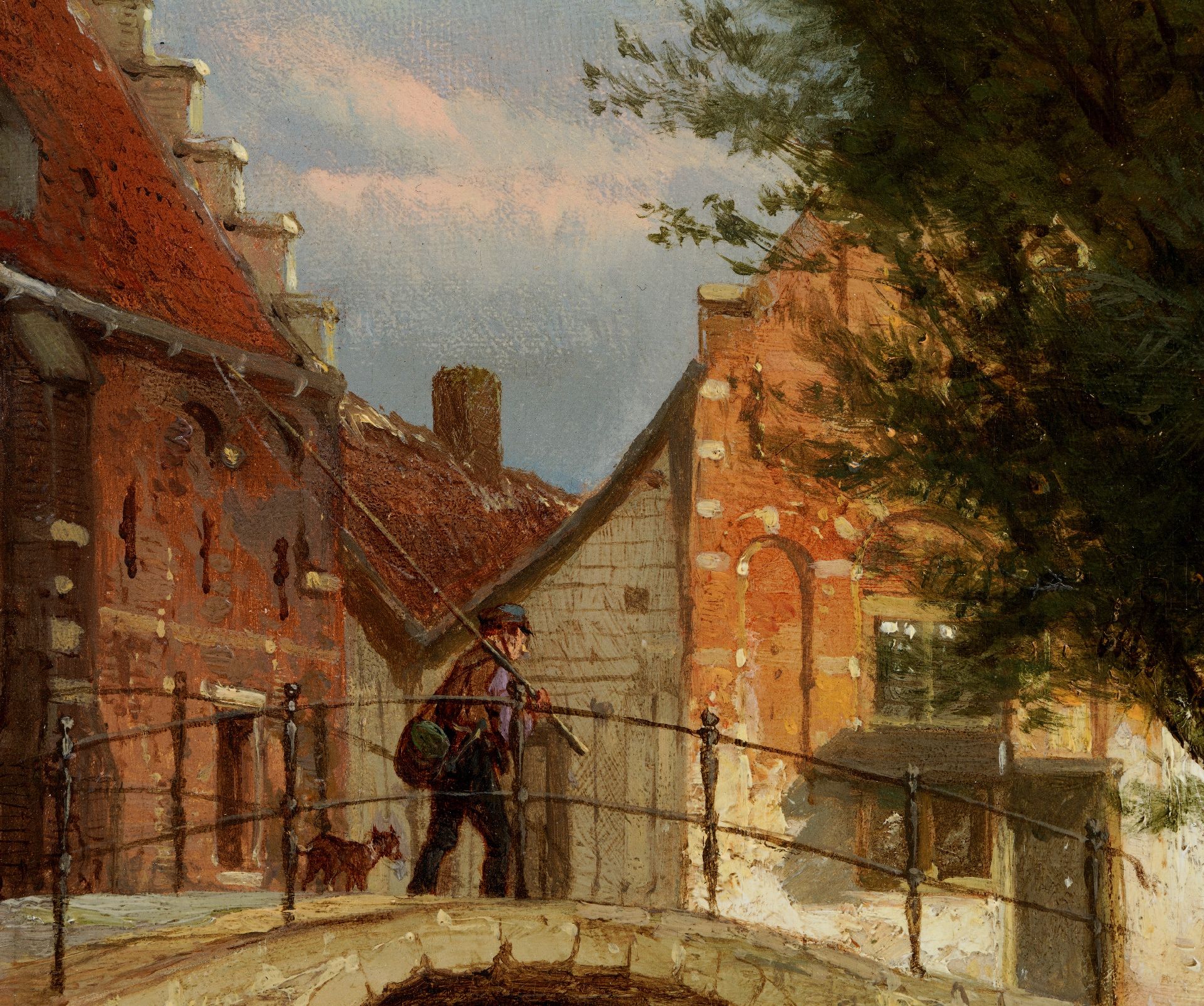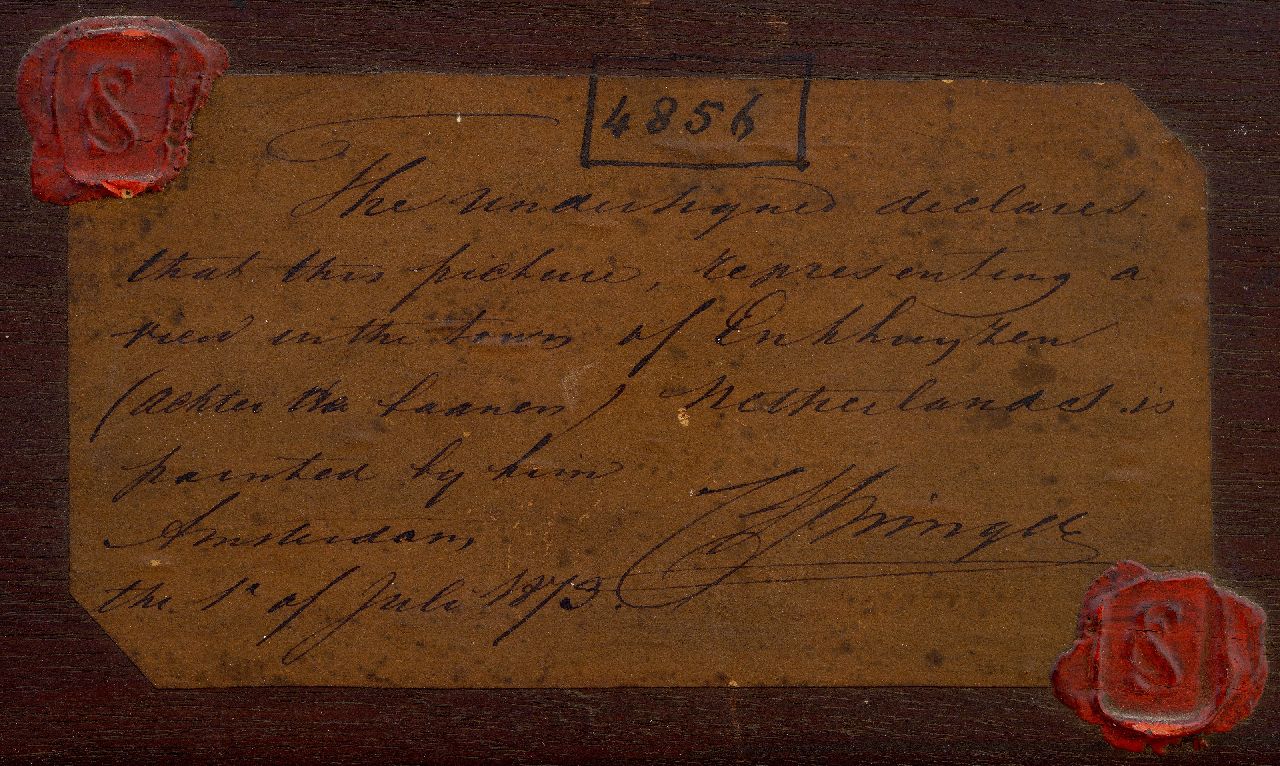 Met verso authenticiteitsverklaring van de schilder op verzegeld etiket: 'The undersigned declares that this picture, representing a view in the town of Enkhuyzen (achter de laanen) Netherlands, is painted bij him. Amsterdam the 1e of July 1873. C. Springer' inv.nr. 4856