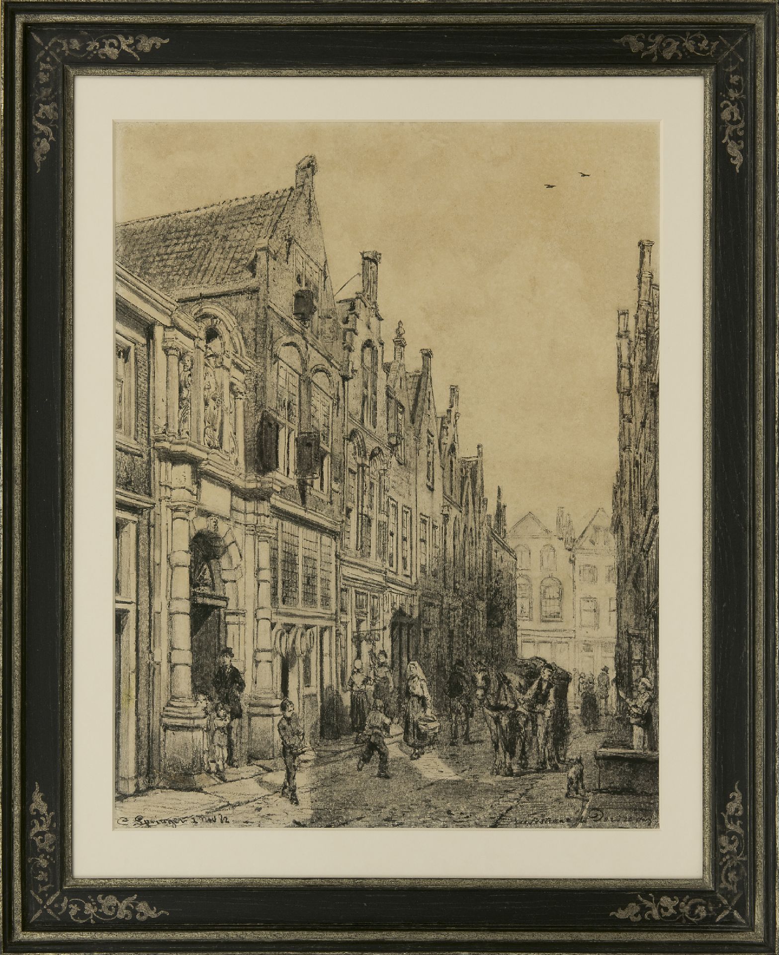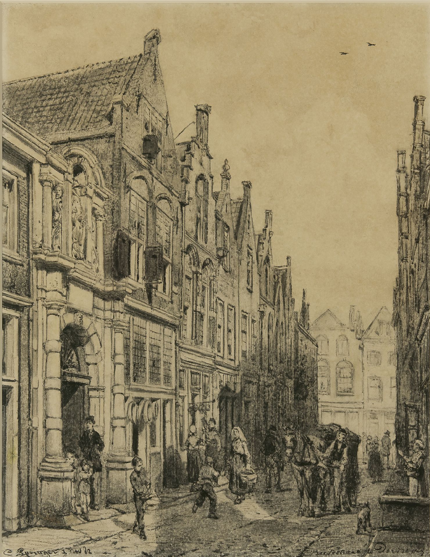 Cornelis Springer schilderde vooral stads- en dorpsgezichten waarin gevels en levendige stoffage baden in een warm zonlicht. Samen met Barend Cornelis Koekkoek en Andreas Schelfhout behoort hij tot de belangrijkste schilders van de Hollandse romantiek. In zijn schilderijen is vaak een prominente plaats toebedeeld aan gebouwen uit de 17e en 18e eeuw. Soms is dit een fantasie-architectuur, maar in de meeste gevallen waren dit bestaande gebouwen waarvan men rond 1850 de schoonheid 'herontdekte'. Springer maakte van deze gebouwen meestal eerst een uitvoerige schets, die hij dan later tot schilderij uitwerkte.