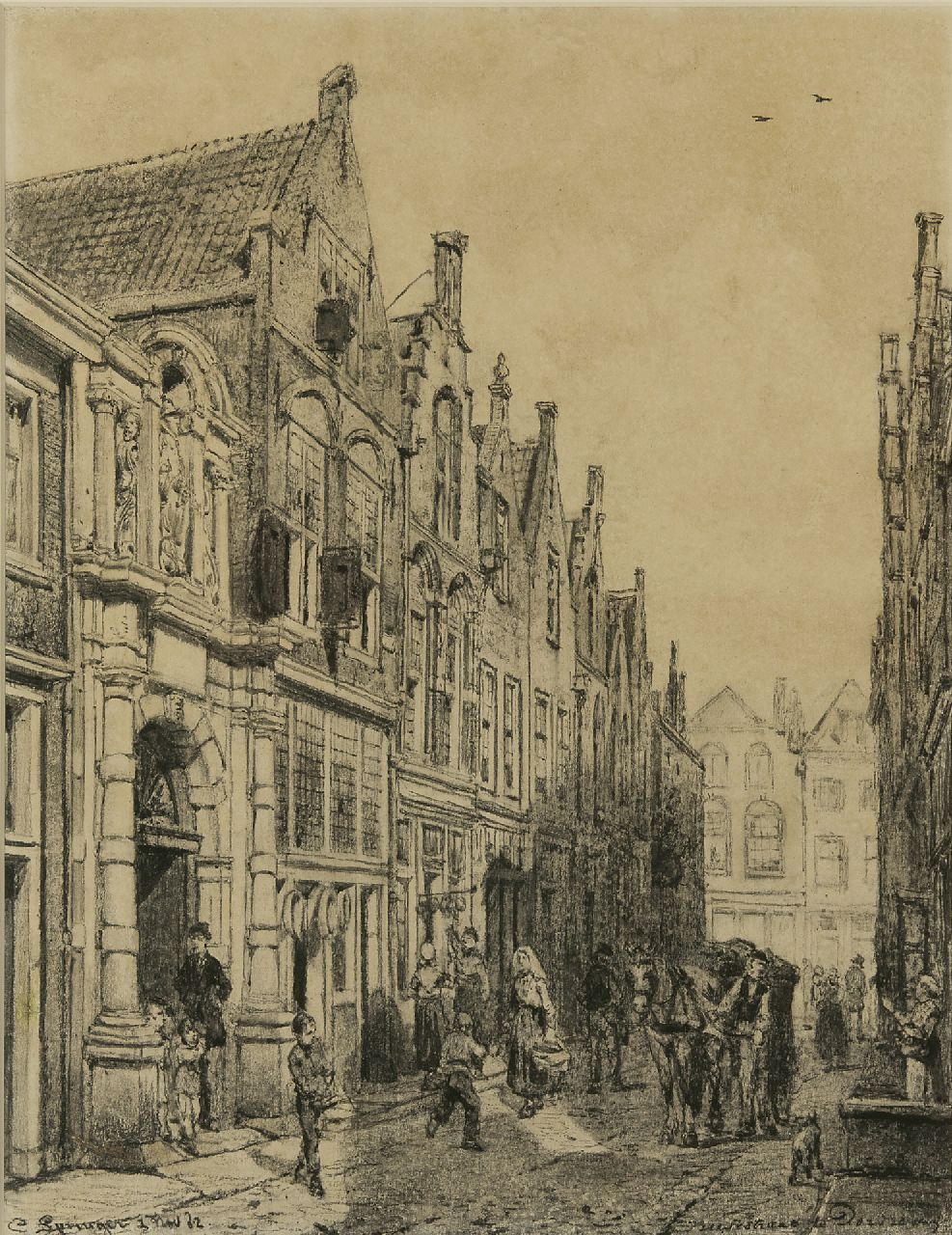 Springer C.  | Cornelis Springer, De Vriesestraat te Dordrecht met de ingang van de Gemeenteschool, houtskool op papier 50,7 x 39,6 cm, gesigneerd linksonder en gedateerd 1 Nov. '82