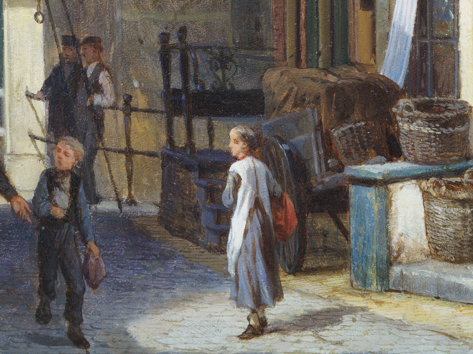 Cornelis Springer kunstwerk • schilderij • voorheen te koop Drukbevolkt straatje 'Binnenveer' in Weesp