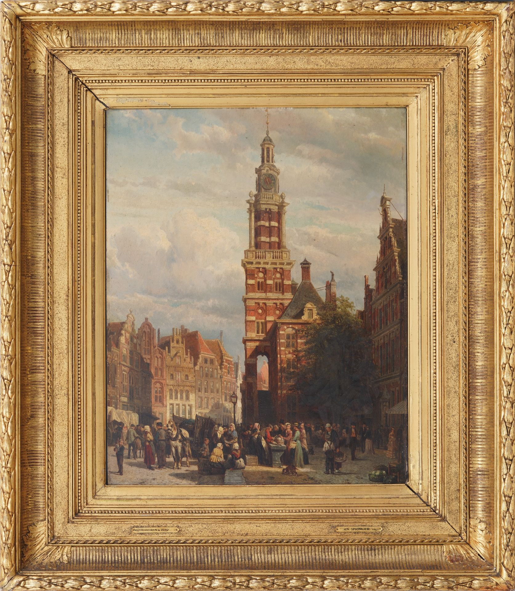 annotatie verso op verzegeld etiket: 'Le soussigné declare que ce tableau represente le marché A la maison d'impots a Zutphen (province de Gelderland, Pays Bas) est peint par lui, Amsterdam 2 Mars 72. C. Springer'