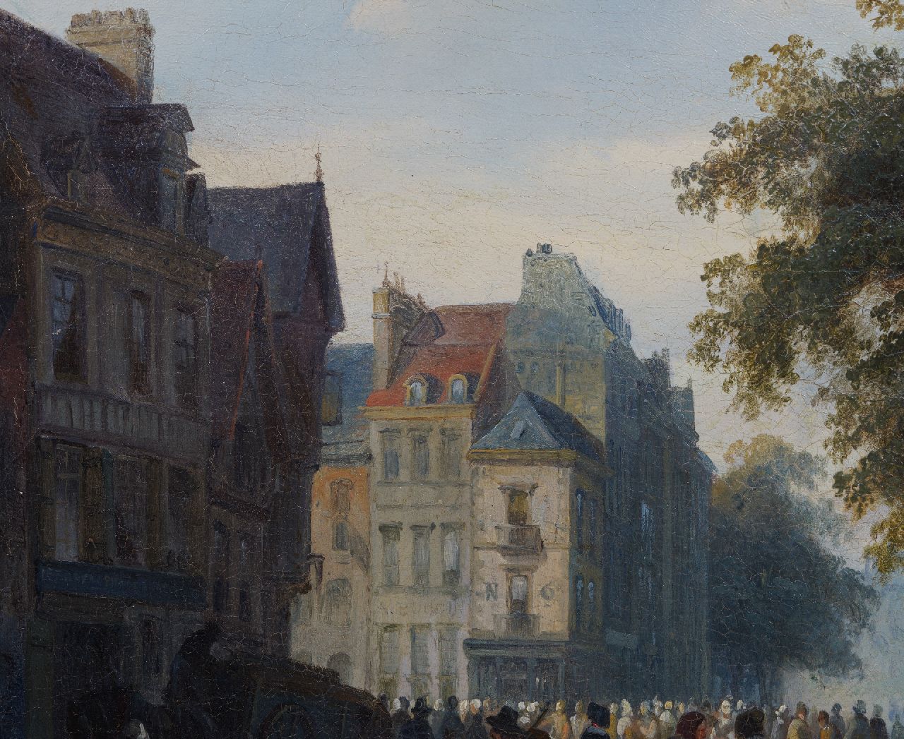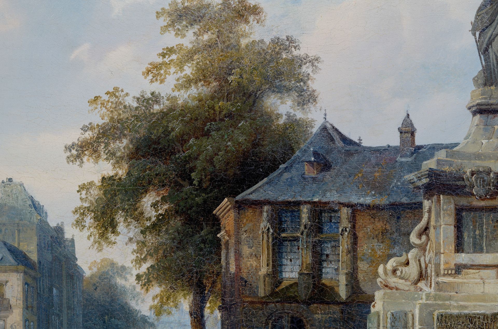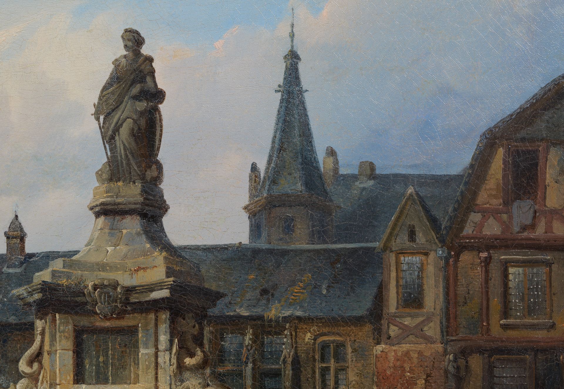 Cornelis Springer, geboren in een familie van bouwkundigen en aannemers, kreeg al jong oog voor de schoonheid van architectuur. Op zijn zeventiende gaat hij in de leer bij Kaspar Karsen, een van de beroemdste stadsgezichtenschilders van zijn tijd. Die neemt zijn leerling in 1837 mee op studiereis door Duitsland, Wenen en Praag. Enthousiast keert Cornelis terug met schetsboeken vol kathedralen, kerkpleinen en beeldhouwwerken. In deze vroege periode schildert hij al de uitmuntende stadsgezichten waar hij beroemd mee zou worden: nauwkeurig uitgewerkt en met aandacht voor materialen, verhoudingen en architectonische details. Het zijn meestal combinaties van bestaande elementen en fantasie-architectuur, in tegenstelling tot de nauwkeurige stadsportretten van latere jaren. Tussen 1841 en 1844 reist hij opnieuw, dit keer ook naar België en Frankrijk. Op basis van daar opgedane indrukken moet hij dit Gezicht op de fontein en het standbeeld van Jeanne d'Arc in Rouen geschilderd hebben. Jeanne d’Arc werd als 19-jarige in 1431 tot de brandstapel veroordeeld in Rouen en later onschuldig bevonden en heilig verklaard in 1920. Het was destijds een echte bezienswaardigheid, besproken en afgebeeld in het in 1835 gepubliceerde uitgave van Abel Hugo, 'France pittoresque et monumentale (…)' die ook in Nederland ruimschoots circuleerde.