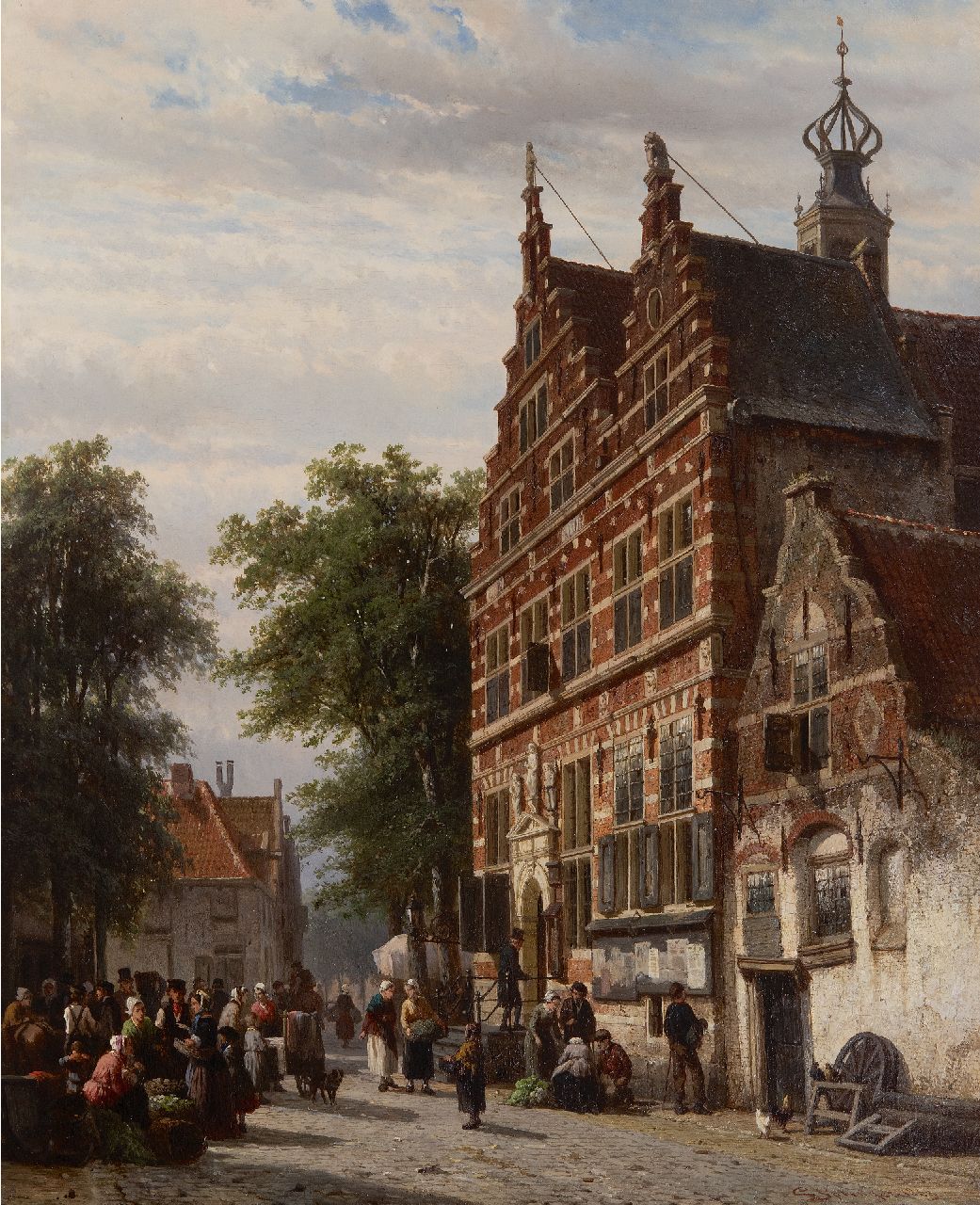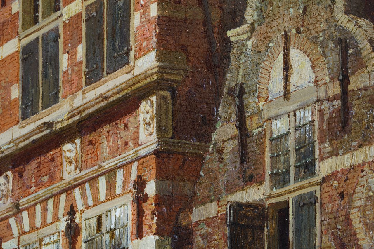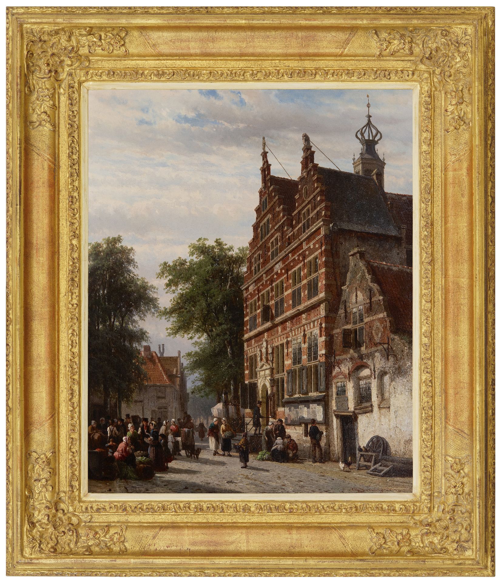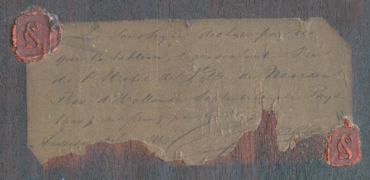 Met verso authenticiteitsverklaring van de schilder op verzegeld etiket: 'Le Soussigné declare par ici que ce tableau, representant Rue de l’Hotel de Ville de Naarden prov. d’Hollande septentrionale Pays Bas, est peint par lui, Amsterdam 1863, C. Springer’’