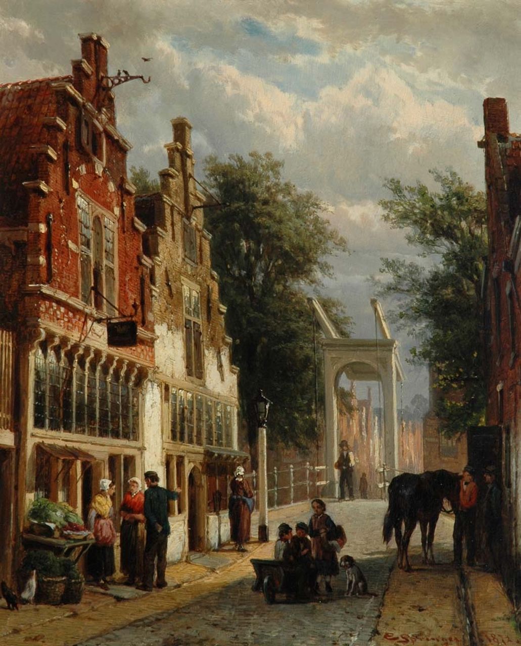 Cornelis Springer schilderde vooral stads- en dorpsgezichten waarin gevels en levendige stoffage baden in een warm zonlicht. Samen met Barend Cornelis Koekkoek en Andreas Schelfhout behoort hij tot de belangrijkste schilders van de Hollandse romantiek. In zijn schilderijen is vaak een prominente plaats toebedeeld aan gebouwen uit de 17e en 18e eeuw. Soms is dit een fantasie-architectuur, maar in de meeste gevallen waren dit bestaande gebouwen waarvan men rond 1850 de schoonheid 'herontdekte'. Springer maakte van deze gebouwen meestal eerst een uitvoerige schets, die hij dan later tot schilderij uitwerkte.