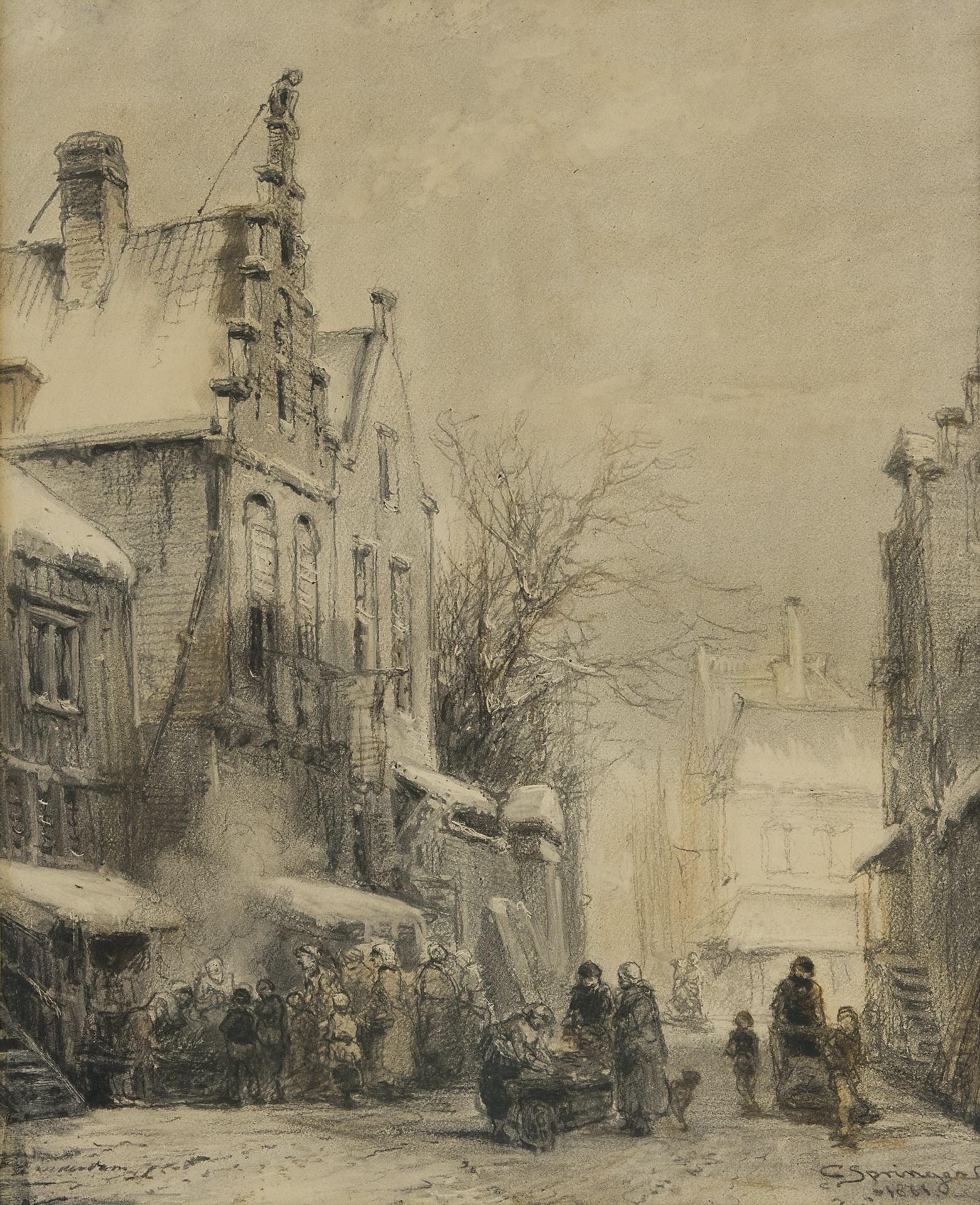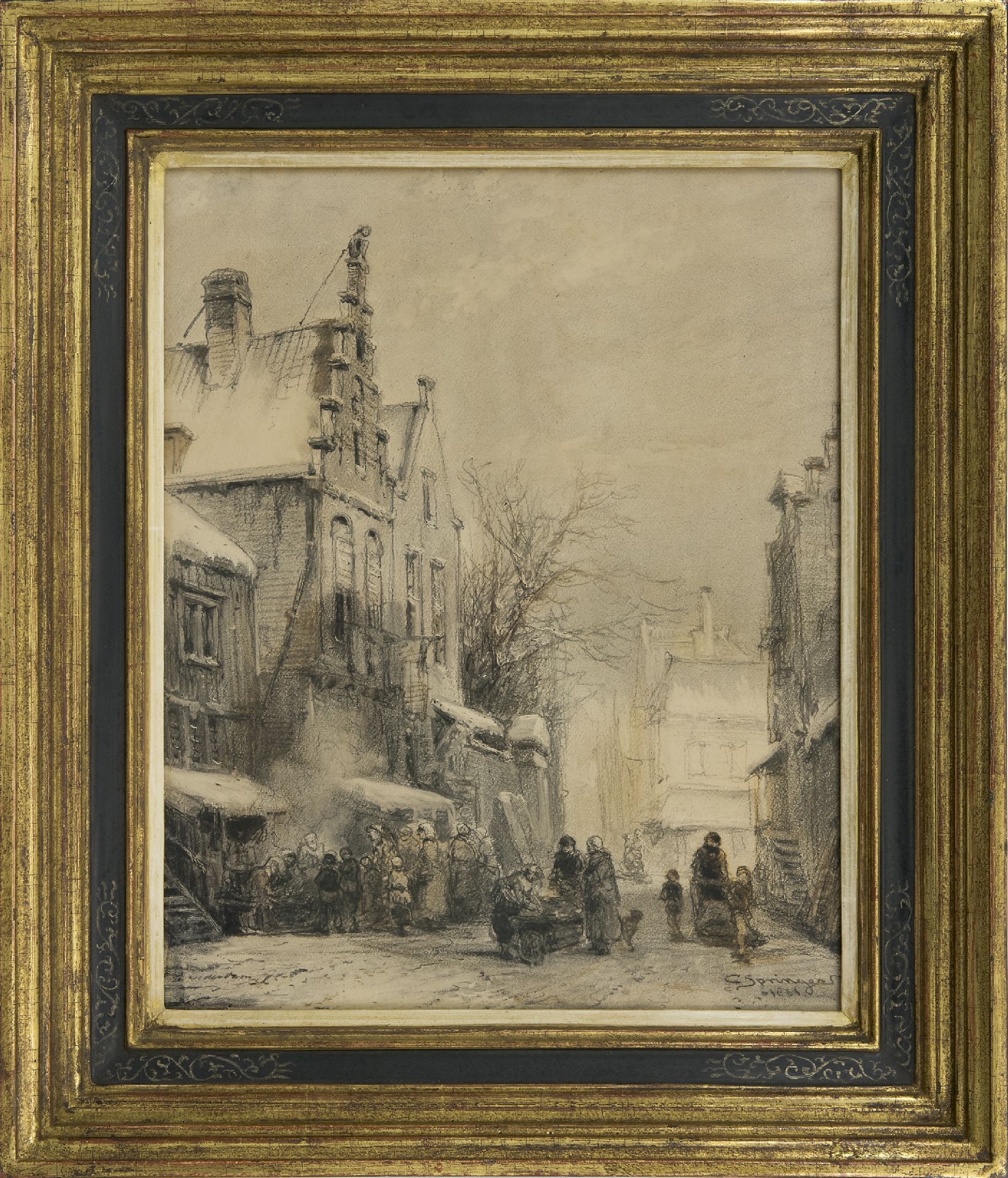 Cornelis Springer kunstwerk • aquarel • tekening • voorheen te koop Winters straatje met figuren