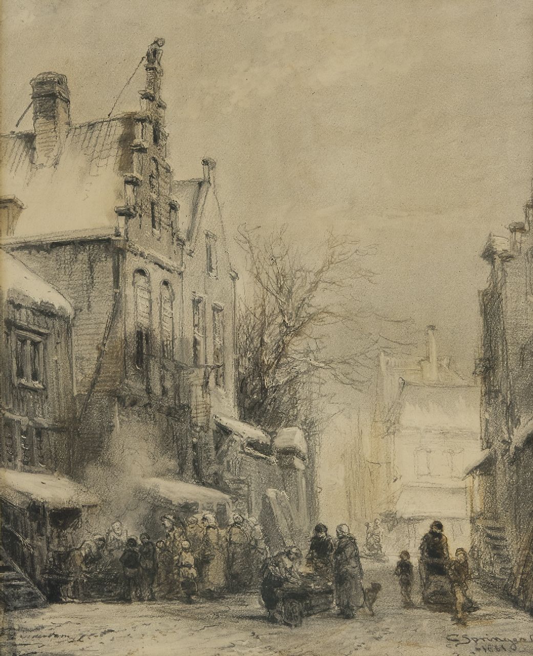 Springer C.  | Cornelis Springer, Winters straatje met figuren, houtskool op papier 50,5 x 40,0 cm, gesigneerd rechtsonder en gedateerd 1861