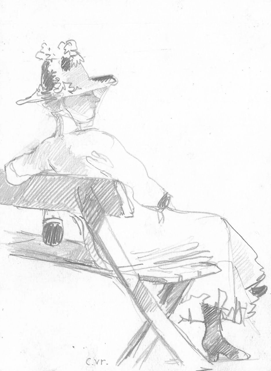 Vreedenburgh C.  | Cornelis Vreedenburgh | Aquarellen en tekeningen te koop aangeboden | Jonge vrouw op een bankje in het park, potlood op papier 15,9 x 12,0 cm, gesigneerd links van het midden. met initialen