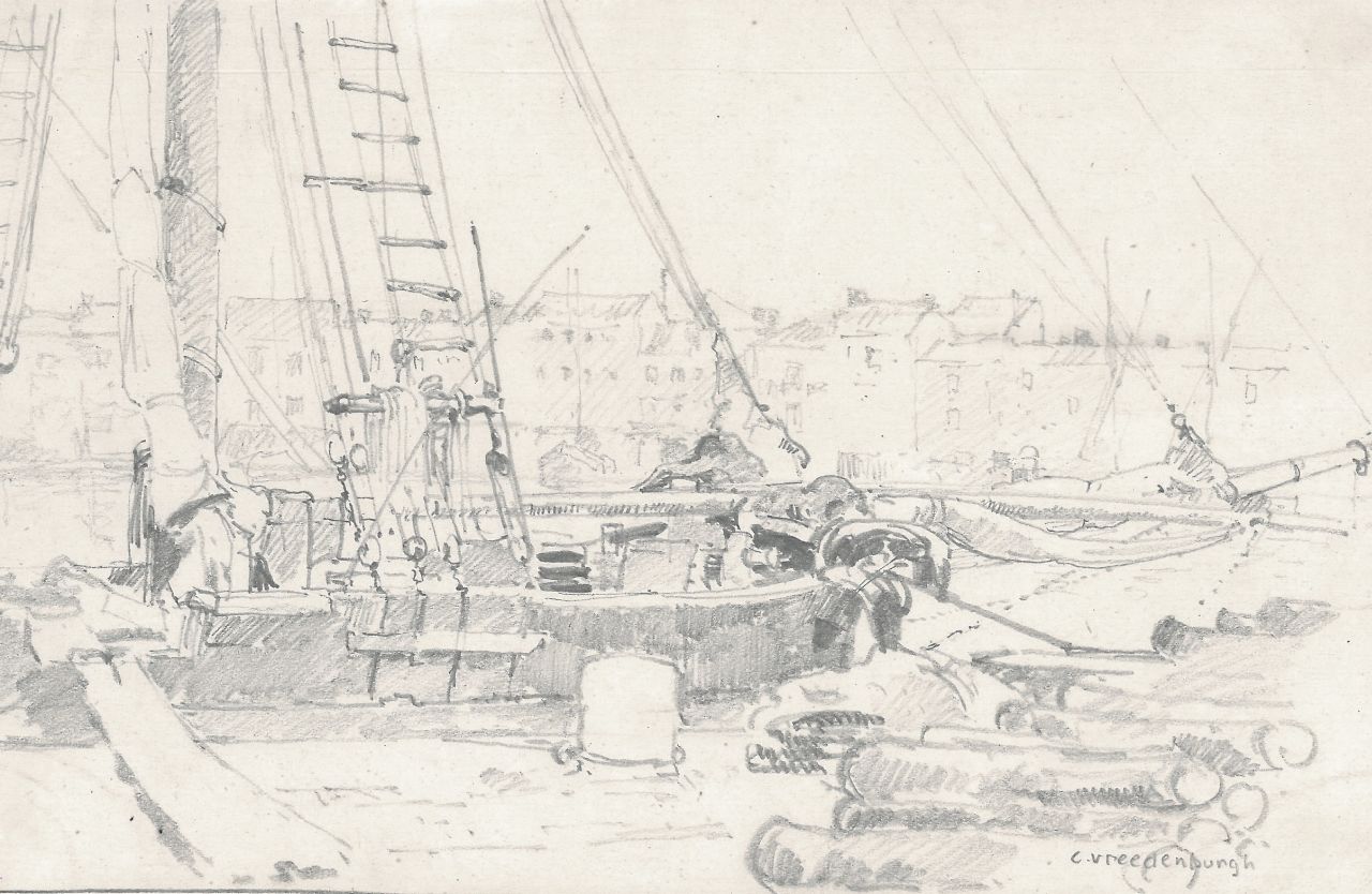 Cornelis Vreedenburgh kunstwerk • aquarel • tekening • voorheen te koop Vrachtschip aan de kade