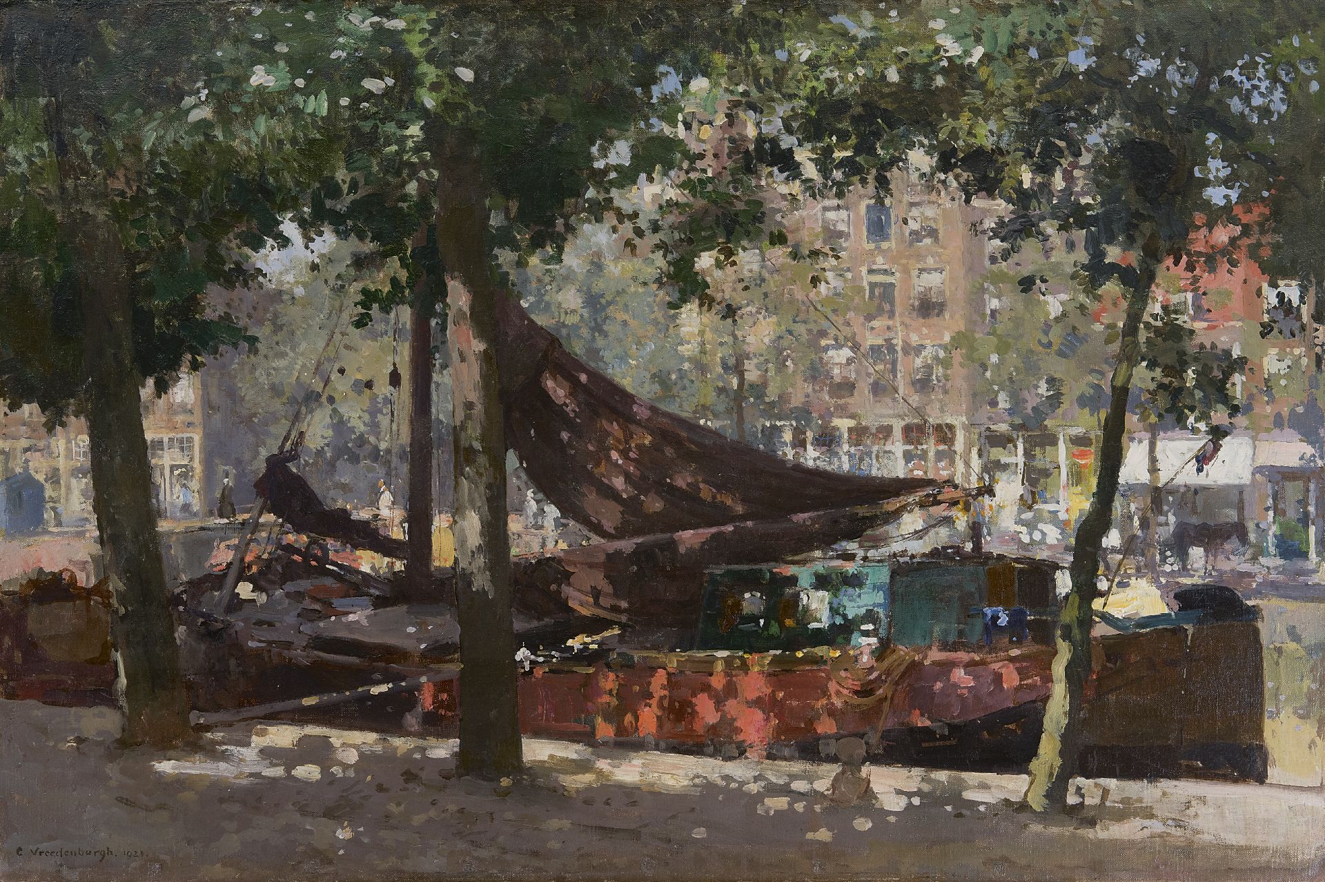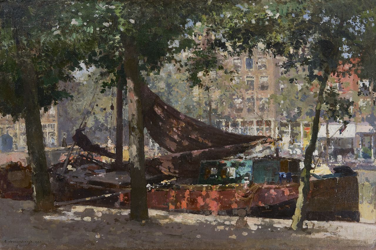 Cornelis Vreedenburgh kunstwerk • schilderij • voorheen te koop Afgemeerde tjalk aan gracht in Amsterdam