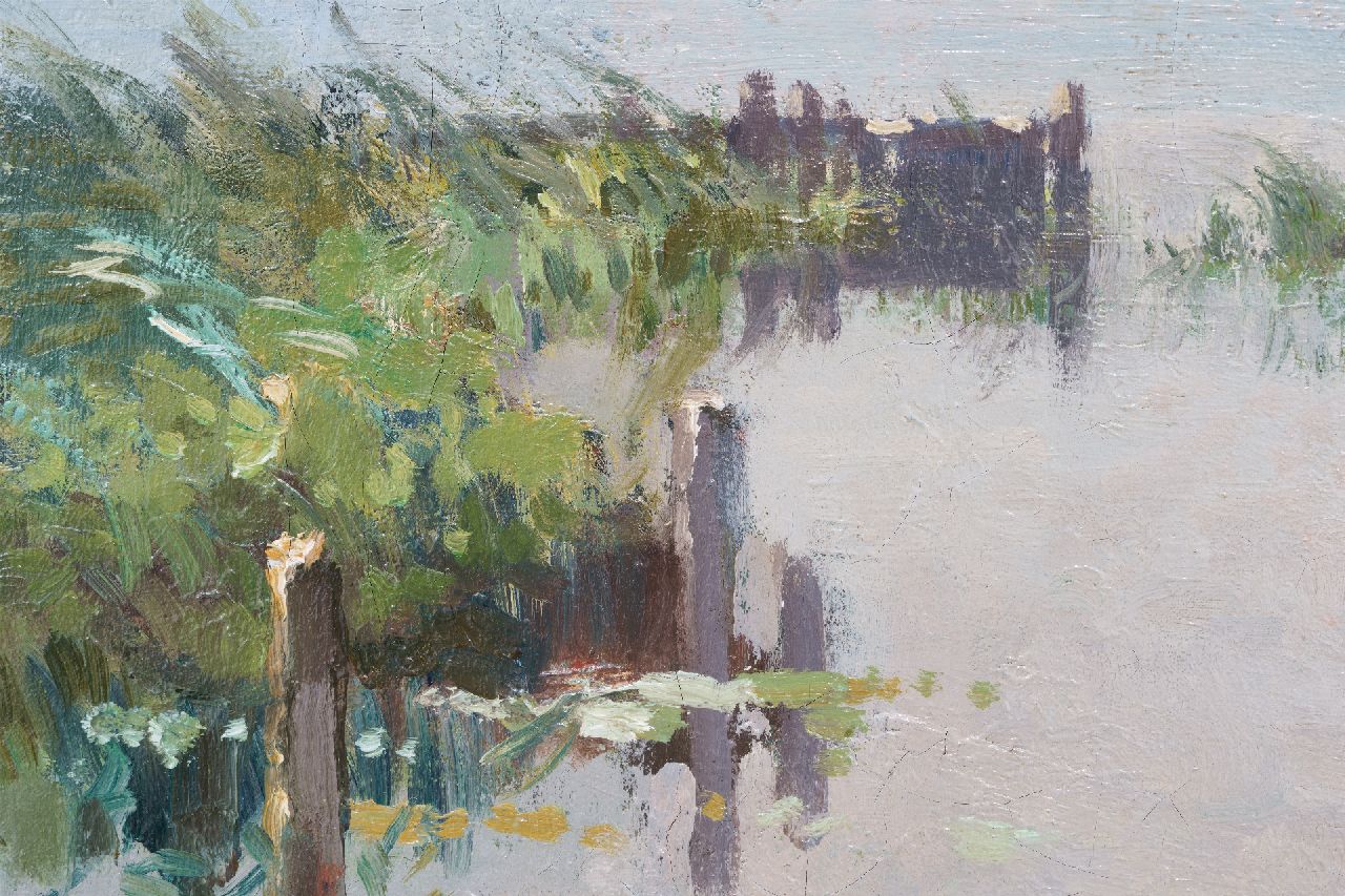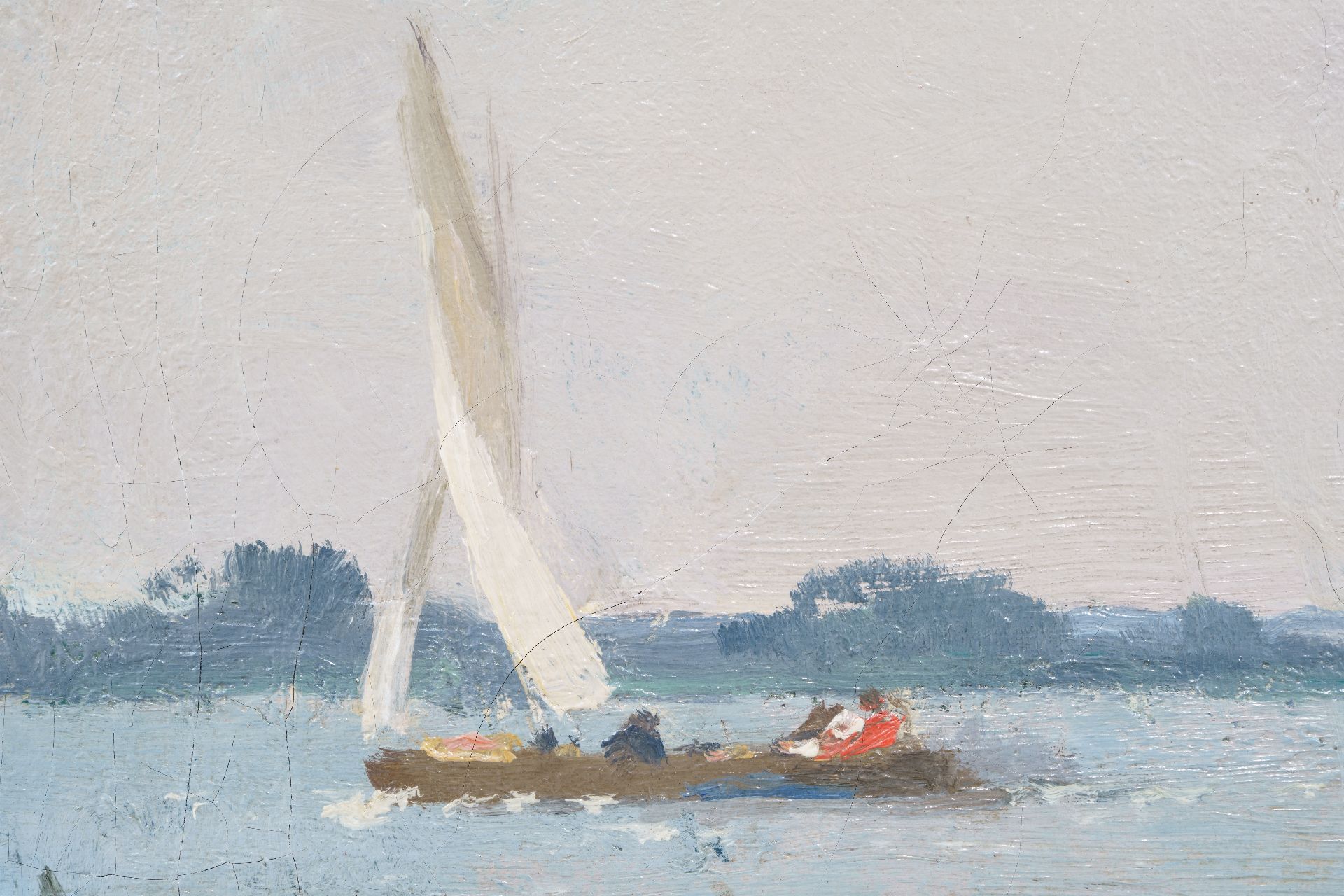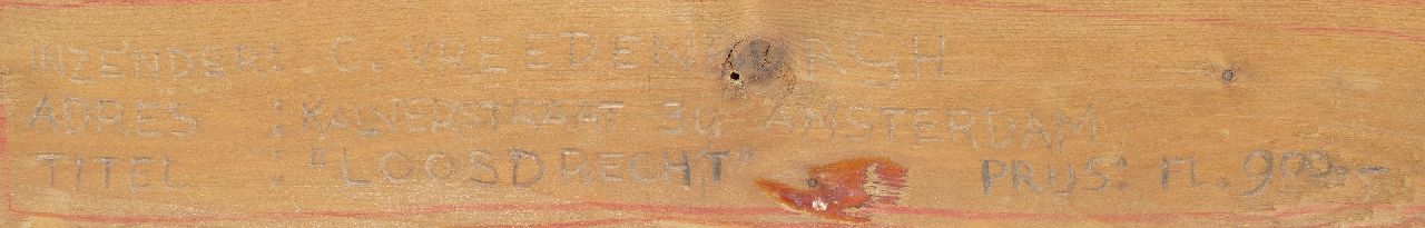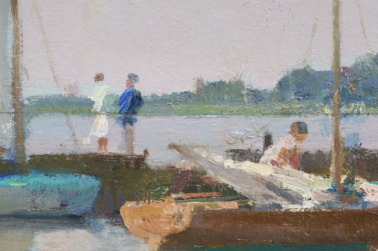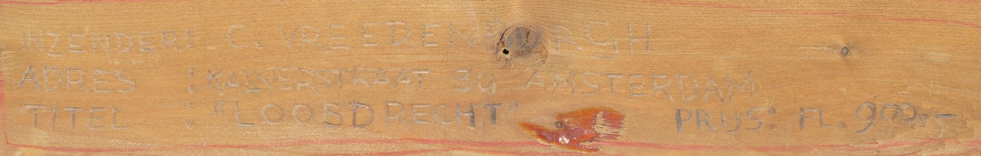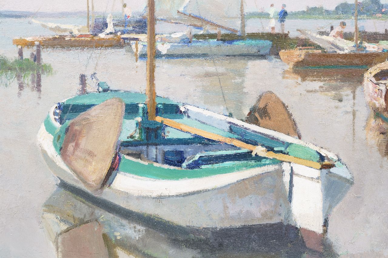 Vreedenburgh, zeer begaafde autodidact, werd door Tholen vaak meegenomen naar de Loosdrechtse Plassen waar ze samen schilderden. De tjotter op de voorgrond is ‘in het blik gezet’. Dit werd gedaan ter conservering van het hout, waarop het blik werd geschilderd, vaak wit.