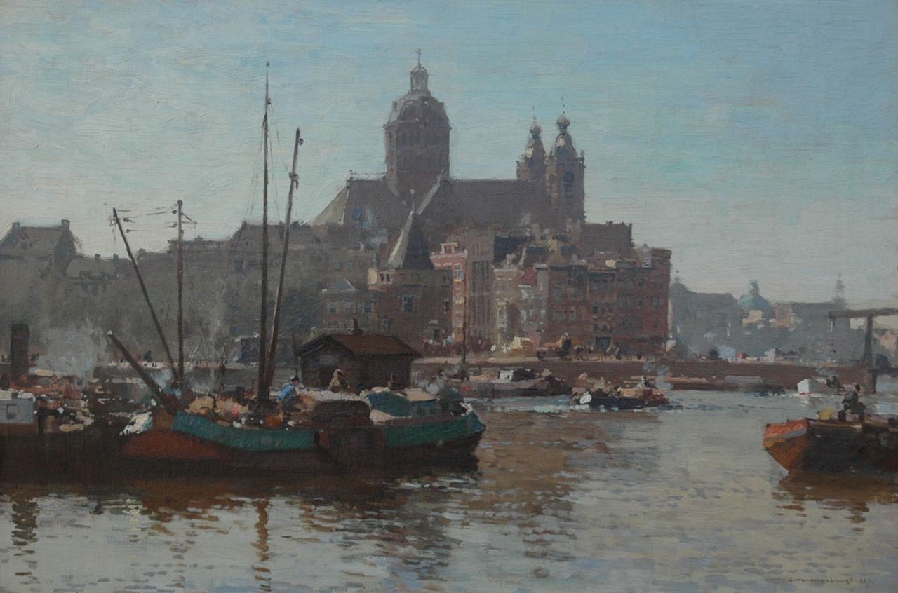 Cornelis Vreedenburgh kunstwerk • schilderij • voorheen te koop Het havenfront van Amsterdam met de St.-Nicolaaskerk