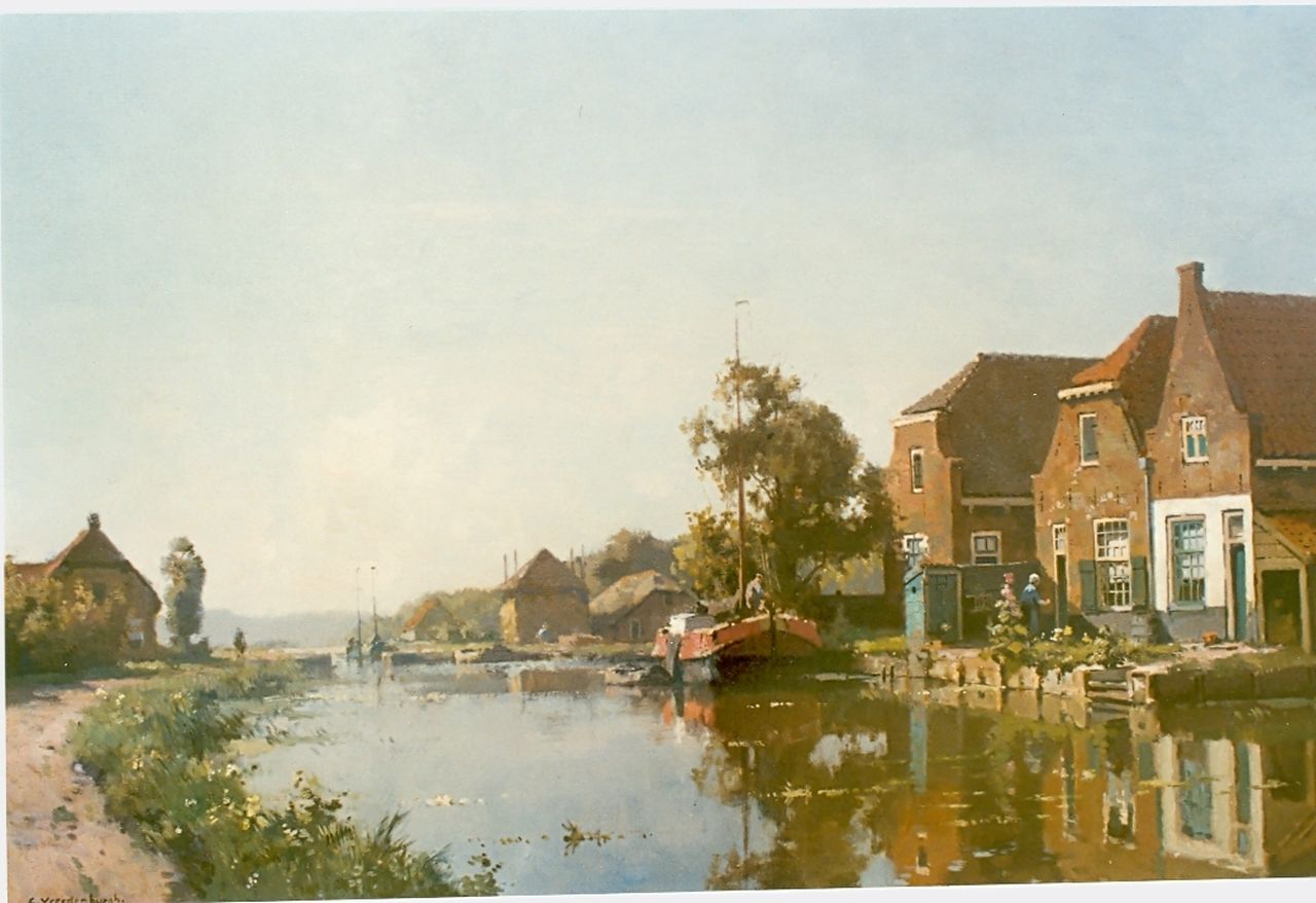 Cornelis Vreedenburgh kunstwerk • schilderij • voorheen te koop Rivierlandschap met afgemeerde tjalk voor boerderijen
