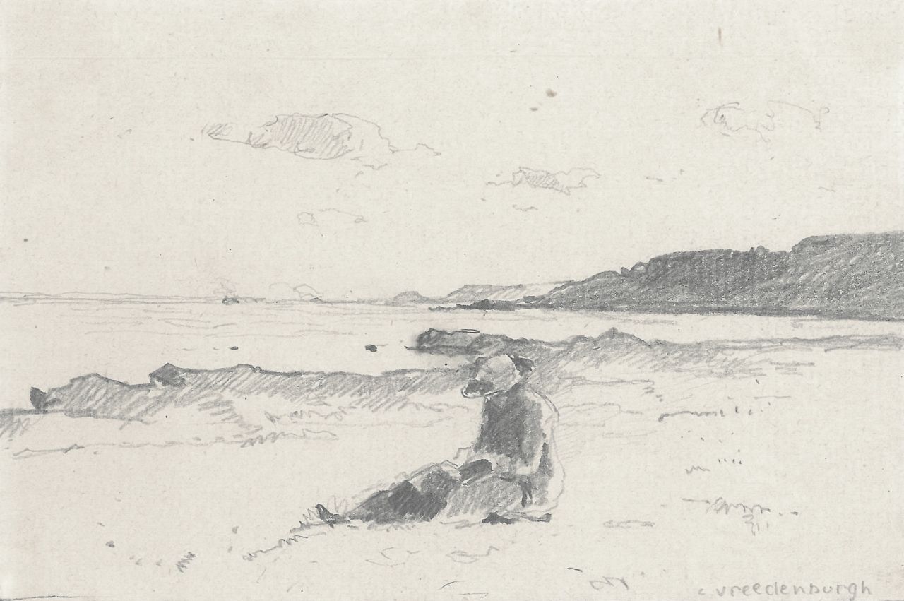 Cornelis Vreedenburgh kunstwerk • aquarel • tekening • voorheen te koop Vrouw lezend op het strand