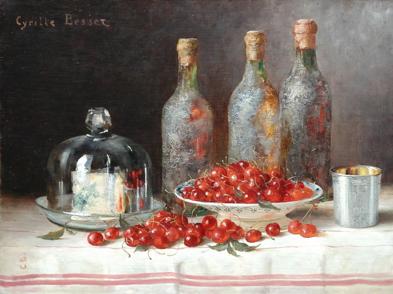 Cyrille Besset kunstwerk • schilderij • voorheen te koop Stilleven met flessen, kaas en kersen