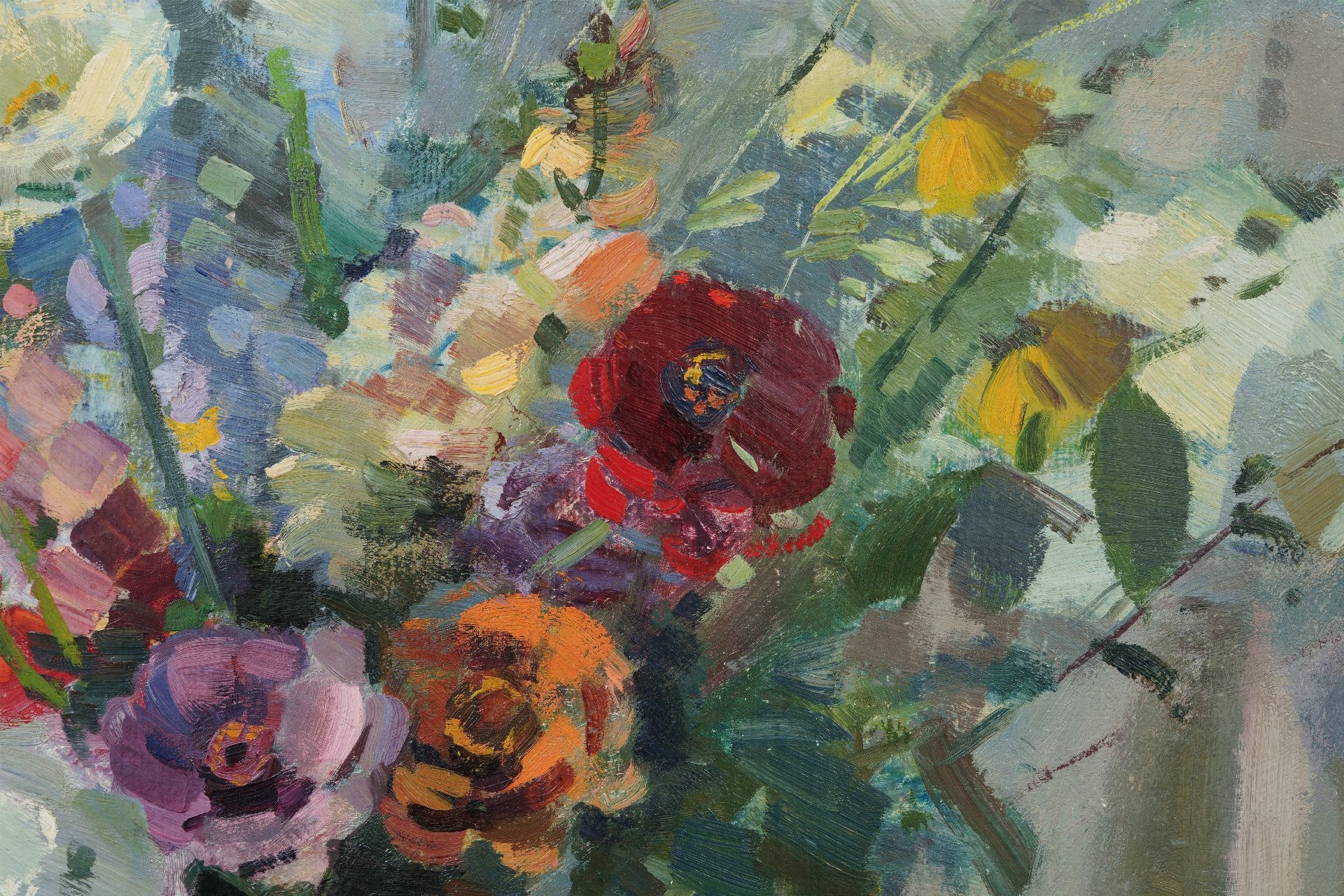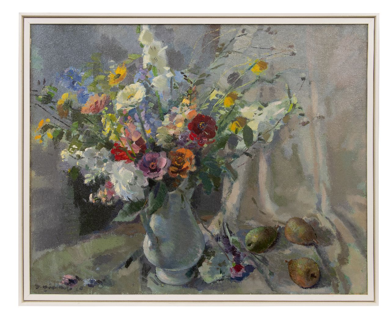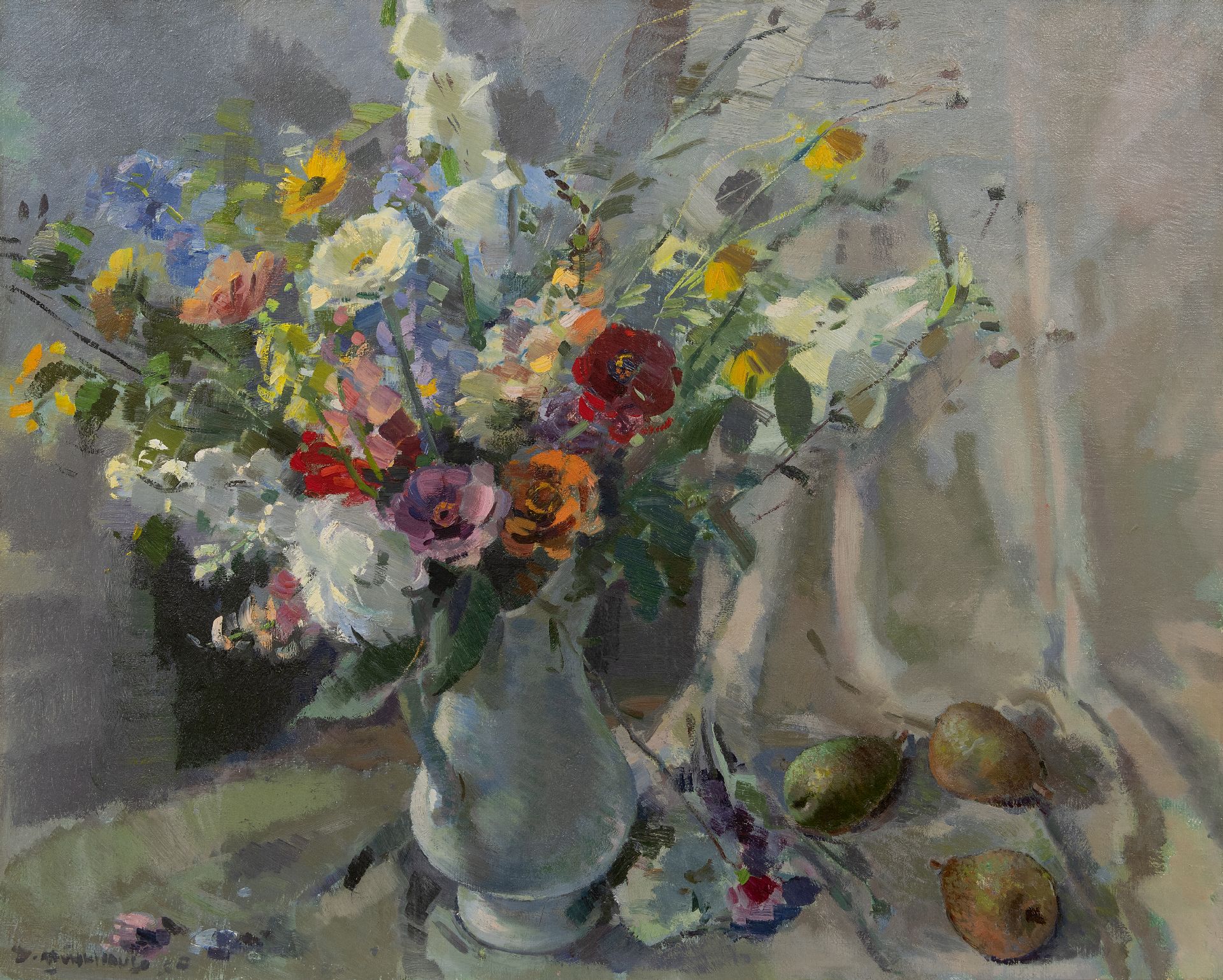 Daan Mühlhaus kunstwerk • schilderij • te koop Stilleven met zomerboeket en peren