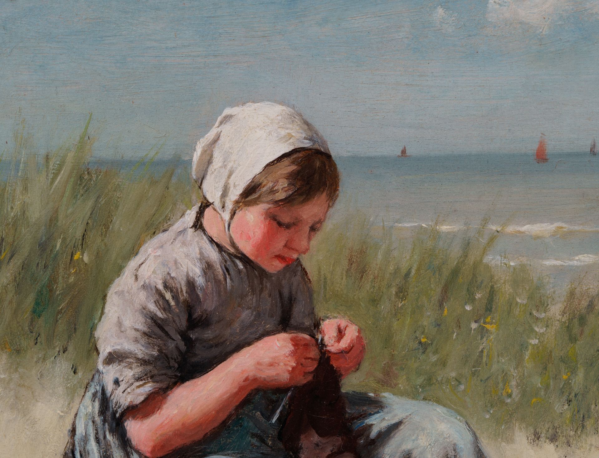 Breiend vissersmeisje in de duinen van Katwijk (alleen tezamen met pendant)