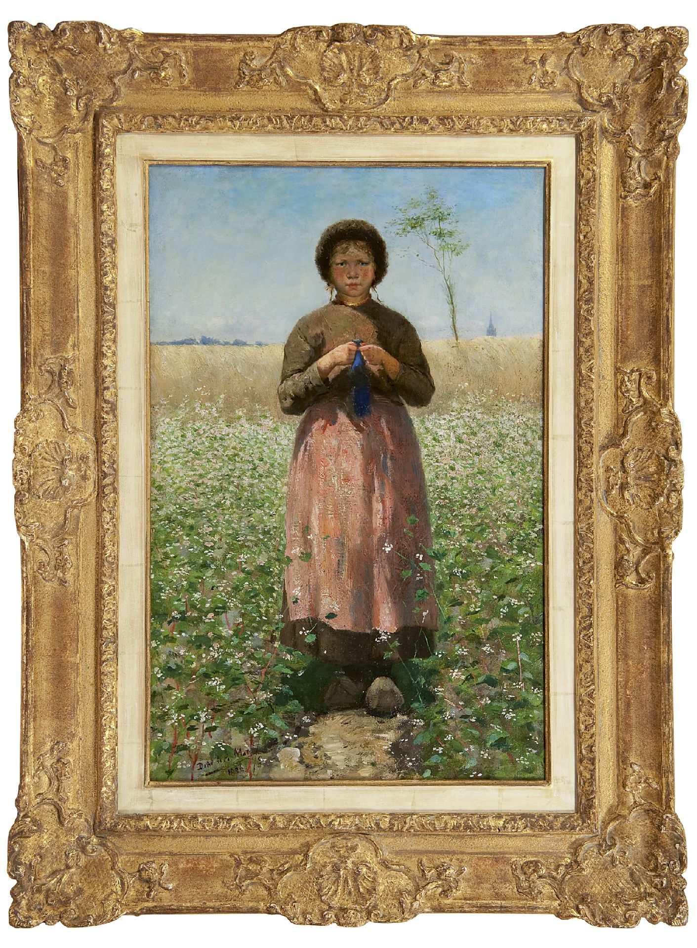 David de la Mar kunstwerk • schilderij • voorheen te koop Breiend meisje in bloeiende boekweitakker