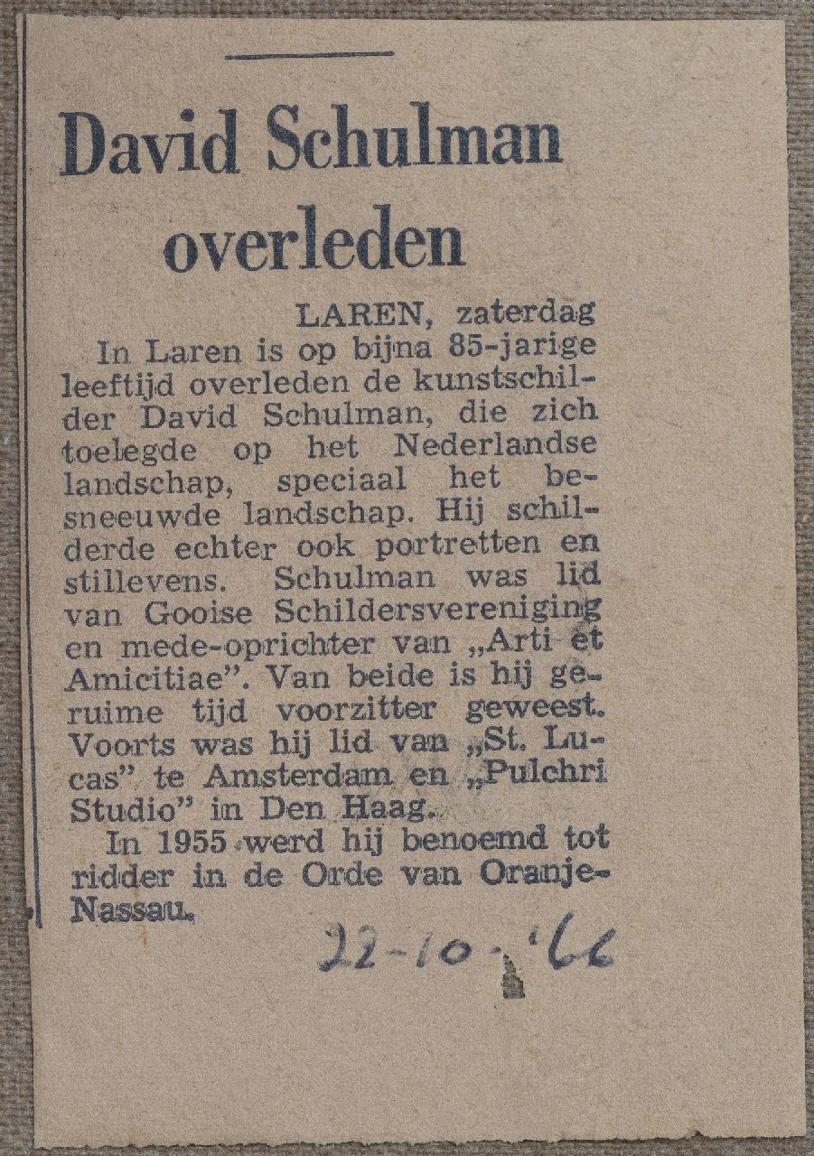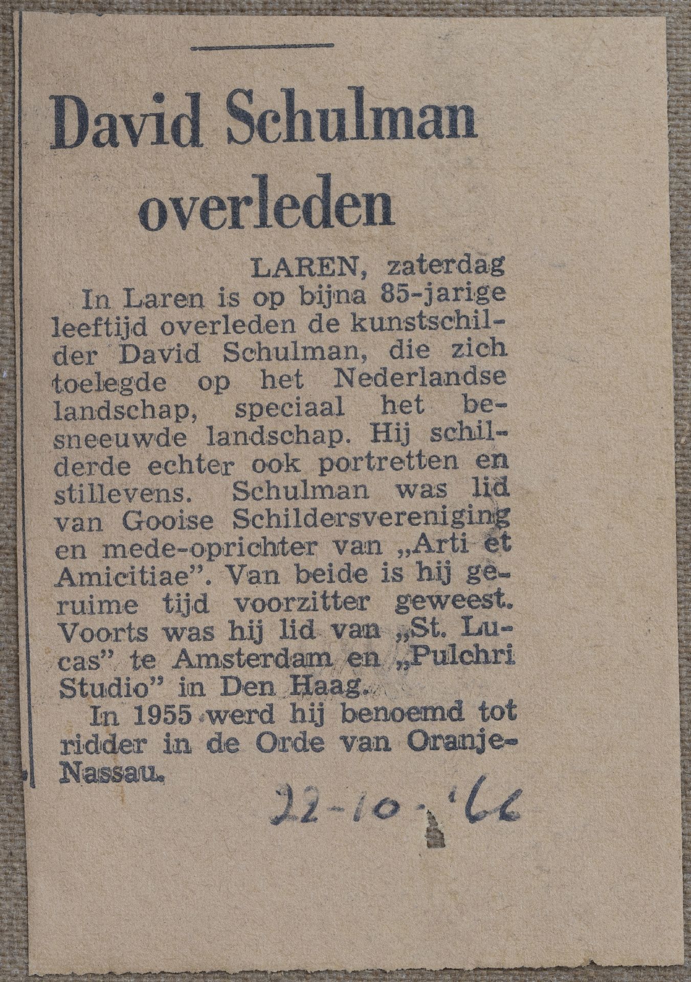 David Schulman, autodidact, was een van de begaafdste schilders van de Larense School. Hij schilderde en tekende Gooise landschappen en besneeuwde dorpsgezichten badend in een helder oranje-gouden zonlicht. Daarnaast bezocht hij regelmatig de vissersdorpjes rond de Zuiderzee en vond hij inspiratie in de levendige drukte rond de Loosdrechtse Plassen. Het werk van Schulman werd al tijdens zijn leven hoog gewaardeerd. Hij ontving veel prijzen en was de grote motor achter de kunstenaarsverenigingen 'De Tien', 'Laren-Blaricum' en de 'Gooische schildersvereniging'. Op 68-jarige leeftijd werd hij voorzitter van Arti et Amicitiae in Amsterdam.