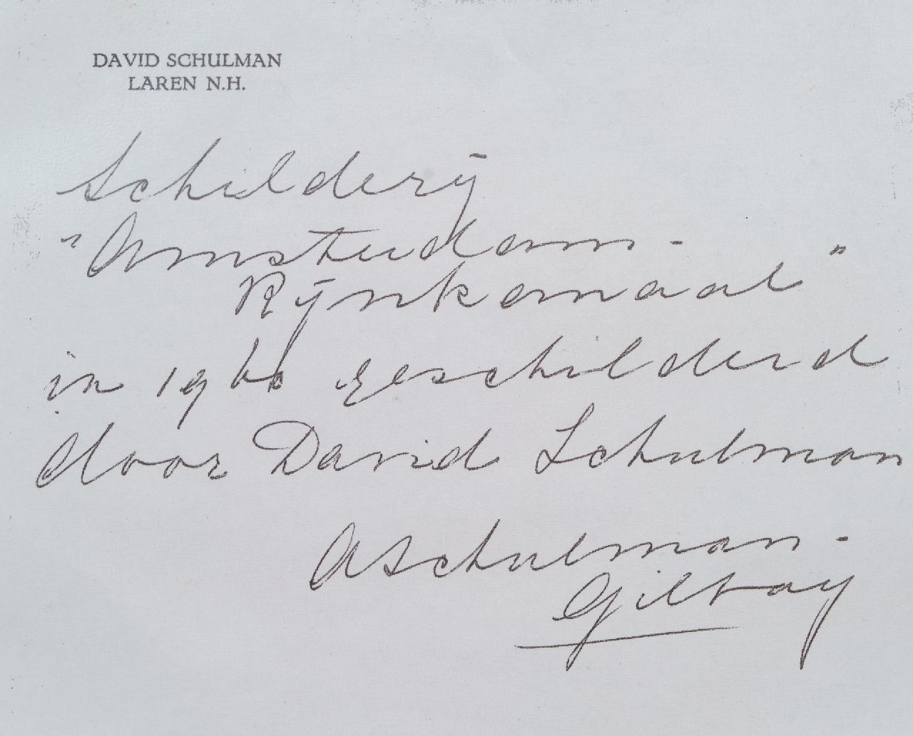 David Schulman, autodidact, was een van de begaafdste schilders van de Larense School. Hij schilderde en tekende Gooise landschappen en besneeuwde dorpsgezichten badend in een helder oranje-gouden zonlicht. Daarnaast bezocht hij regelmatig de vissersdorpjes rond de Zuiderzee en vond hij inspiratie in de levendige drukte rond de Loosdrechtse Plassen. Het werk van Schulman werd al tijdens zijn leven hoog gewaardeerd. Hij ontving veel prijzen en was de grote motor achter de kunstenaarsverenigingen 'De Tien', 'Laren-Blaricum' en de 'Gooische schildersvereniging'. Op 68-jarige leeftijd werd hij voorzitter van Arti et Amicitiae in Amsterdam.