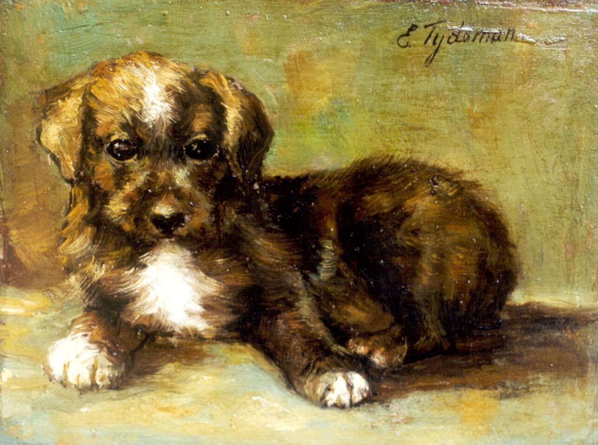 Tijdeman E.M.  | Ernestine Marie 'Dé' Tijdeman, Jong hondje, olieverf op paneel 14,5 x 19,2 cm, gesigneerd rechtsboven