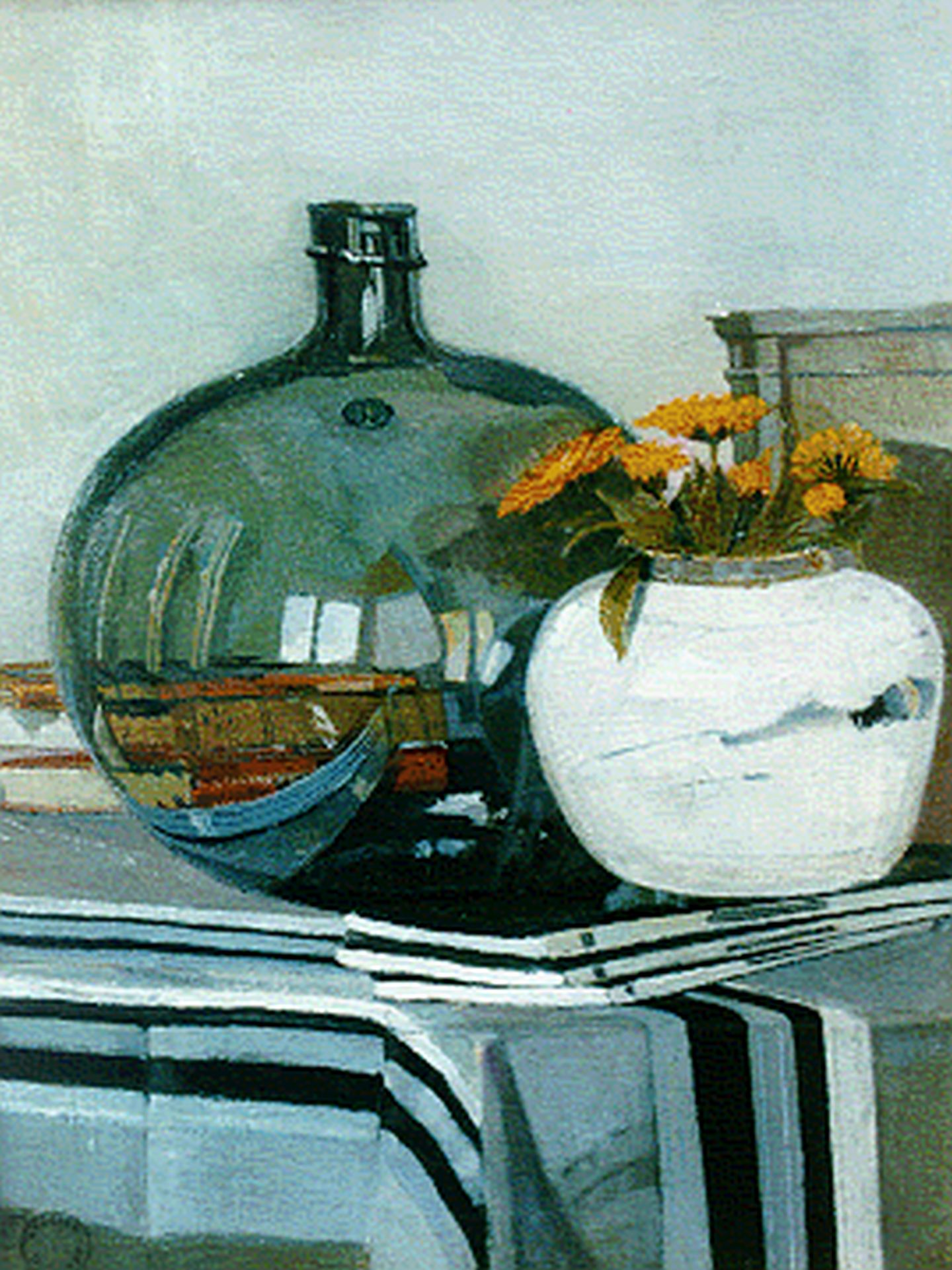 Dick Ket kunstwerk • schilderij • voorheen te koop Stilleven met boeken, zoutzuurfles, bloemen in gemberpot