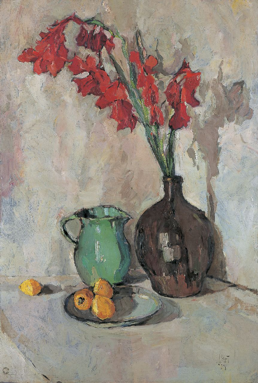 Dick Ket kunstwerk • schilderij • voorheen te koop Stilleven met rode gladiolen in bruine kruik en citroenen
