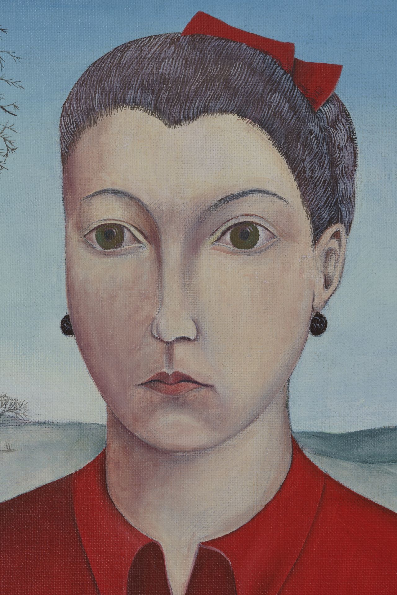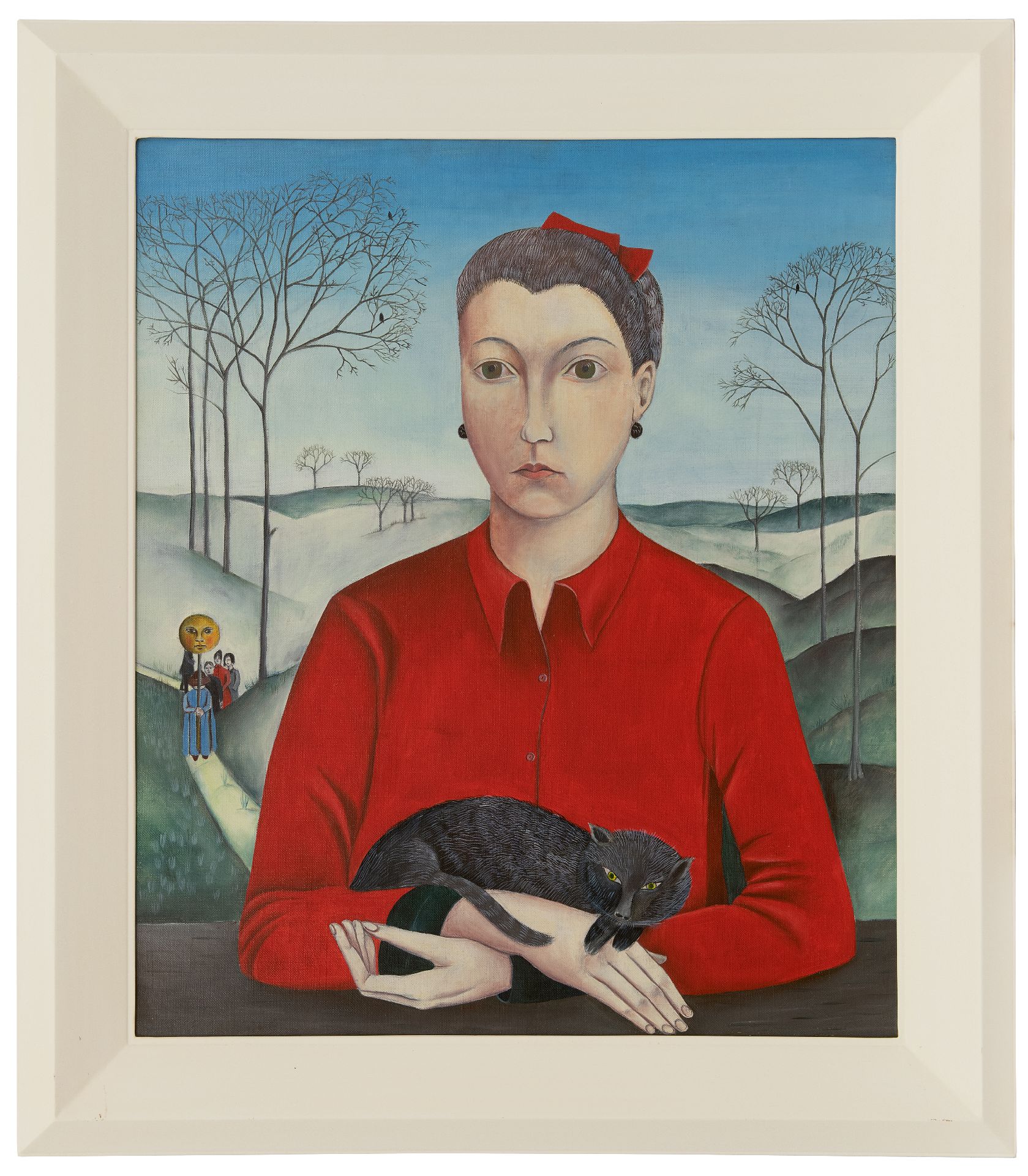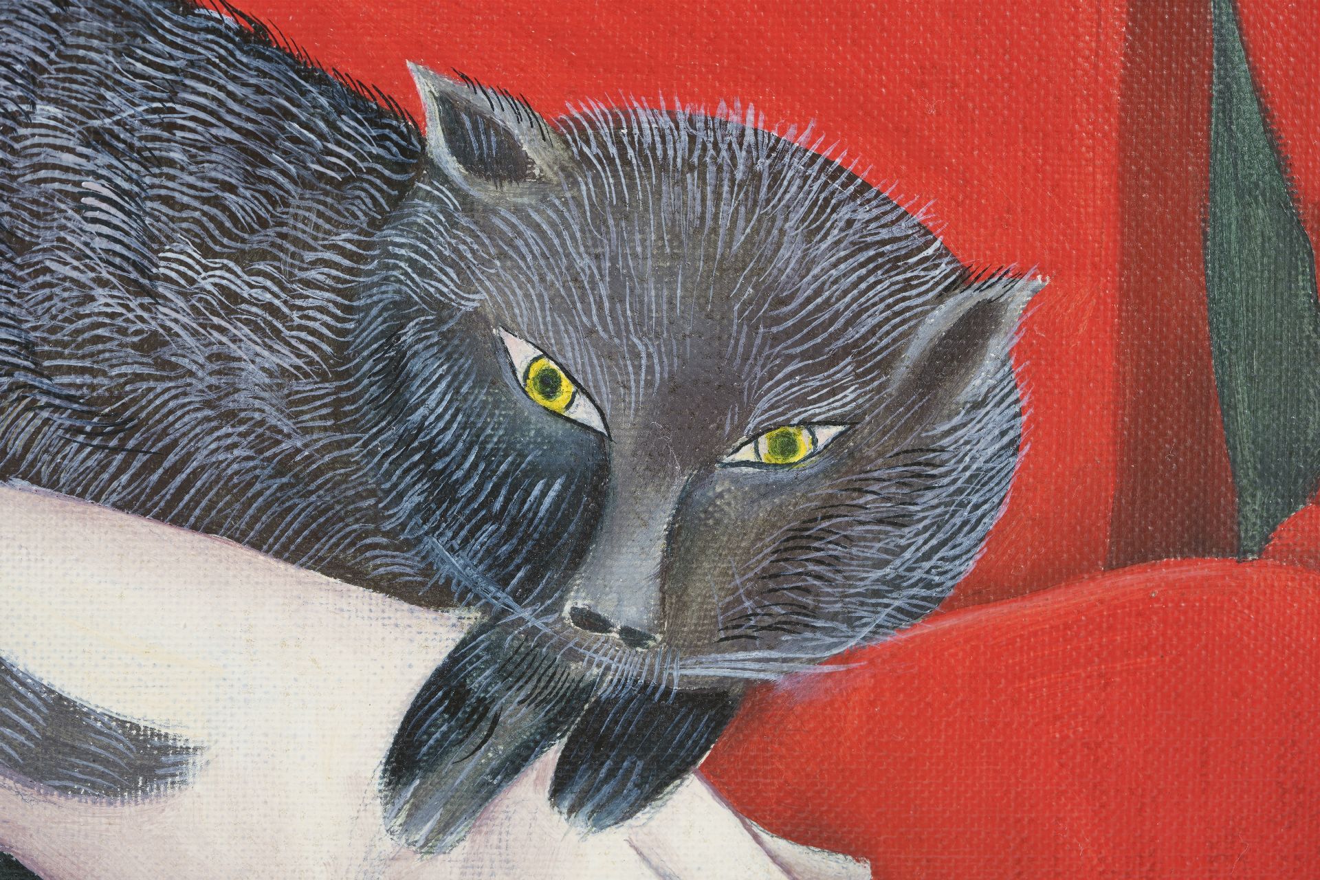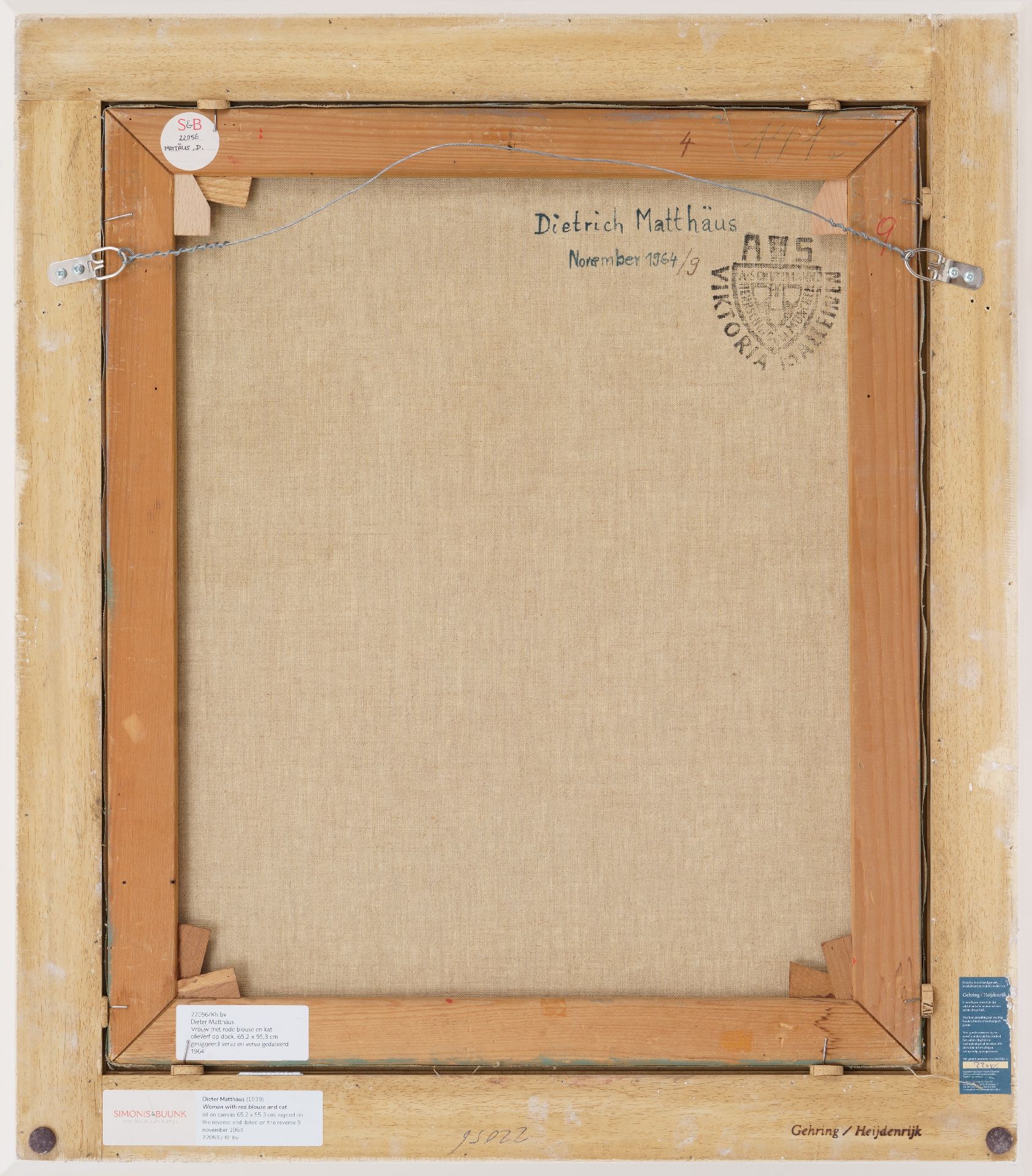 Dieter Matthäus kunstwerk • schilderij • voorheen te koop Vrouw in rode blouse met kat