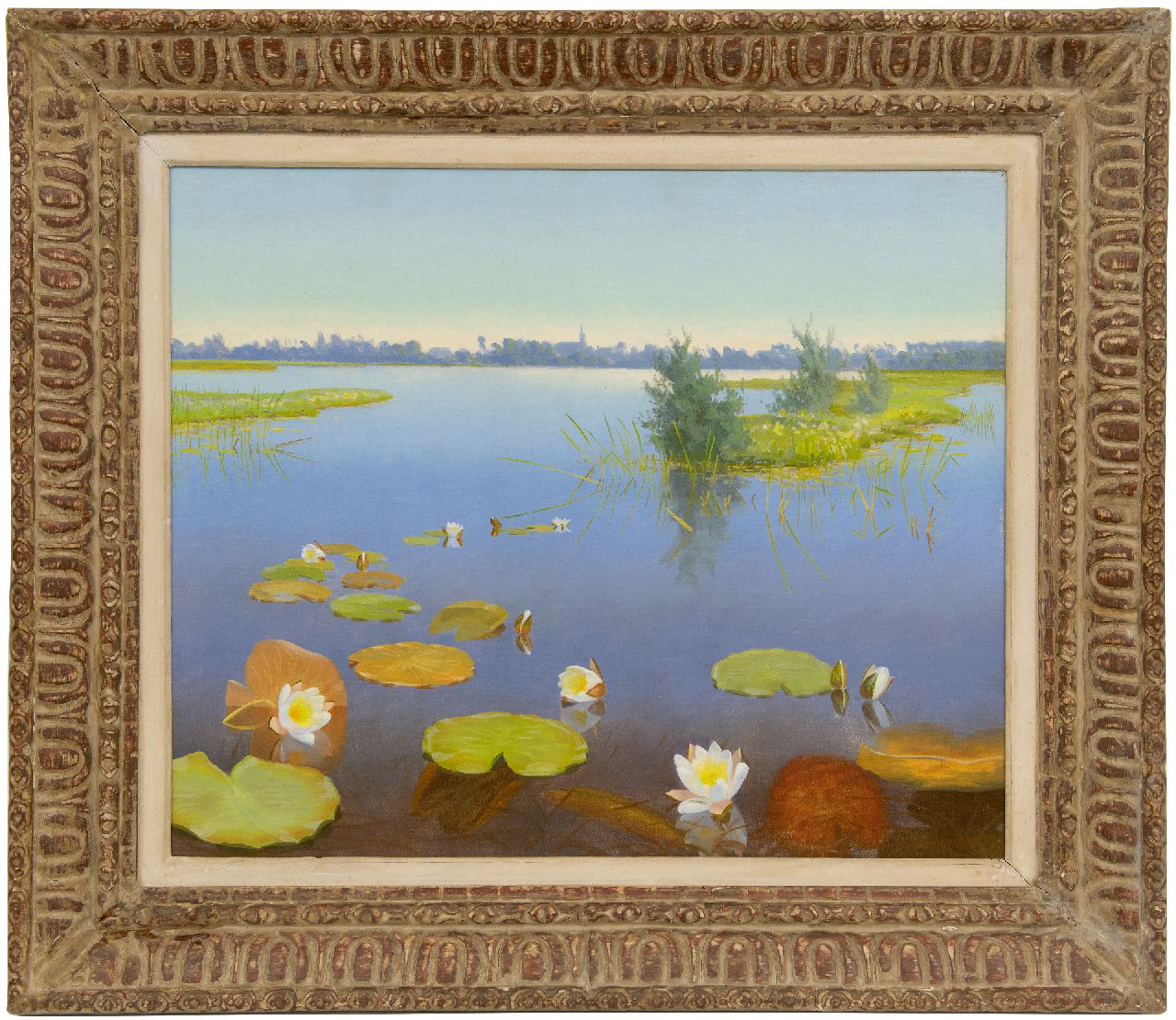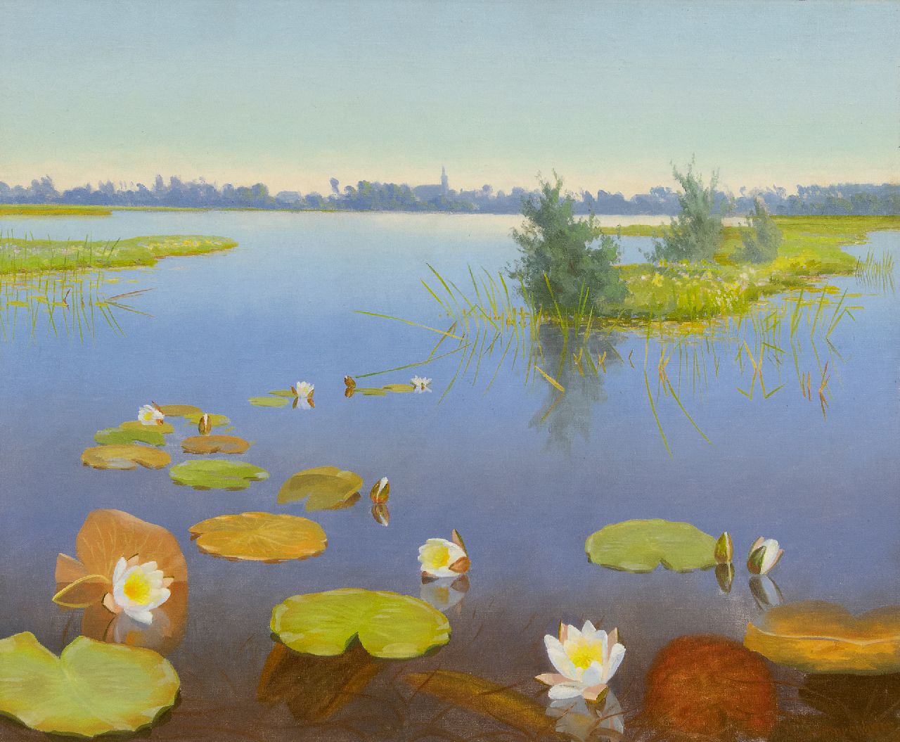 Dirk Smorenberg kunstwerk • schilderij • te koop Gezicht op de Loosdrechtse Plassen met waterlelies en legakkers