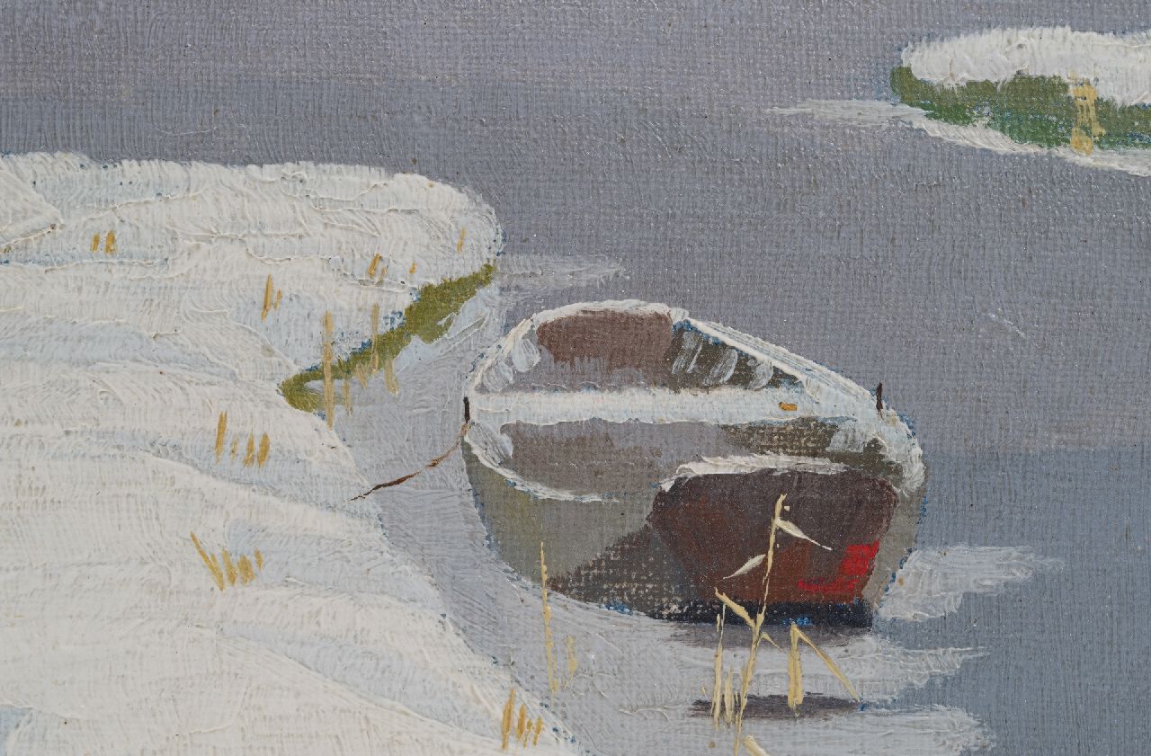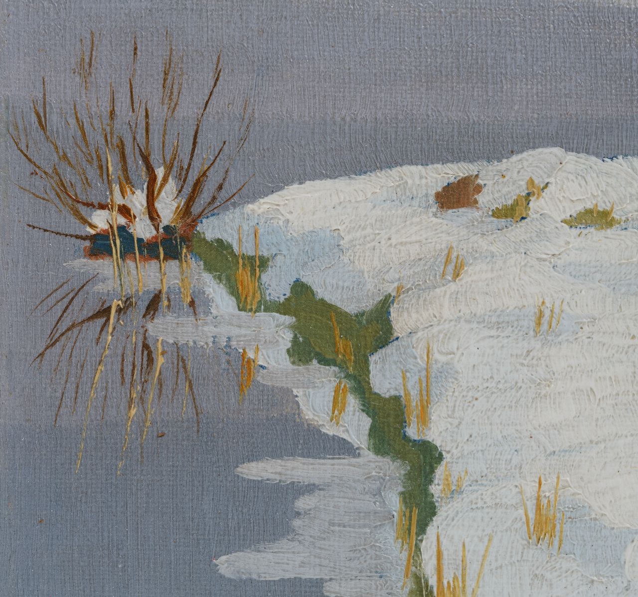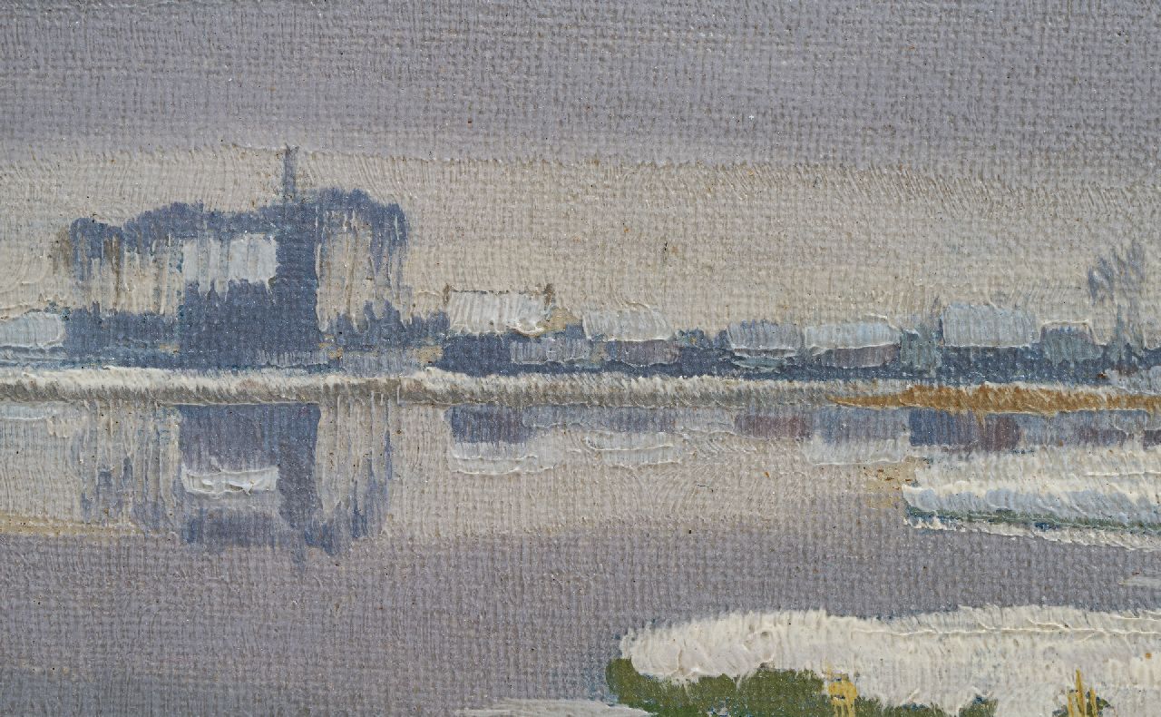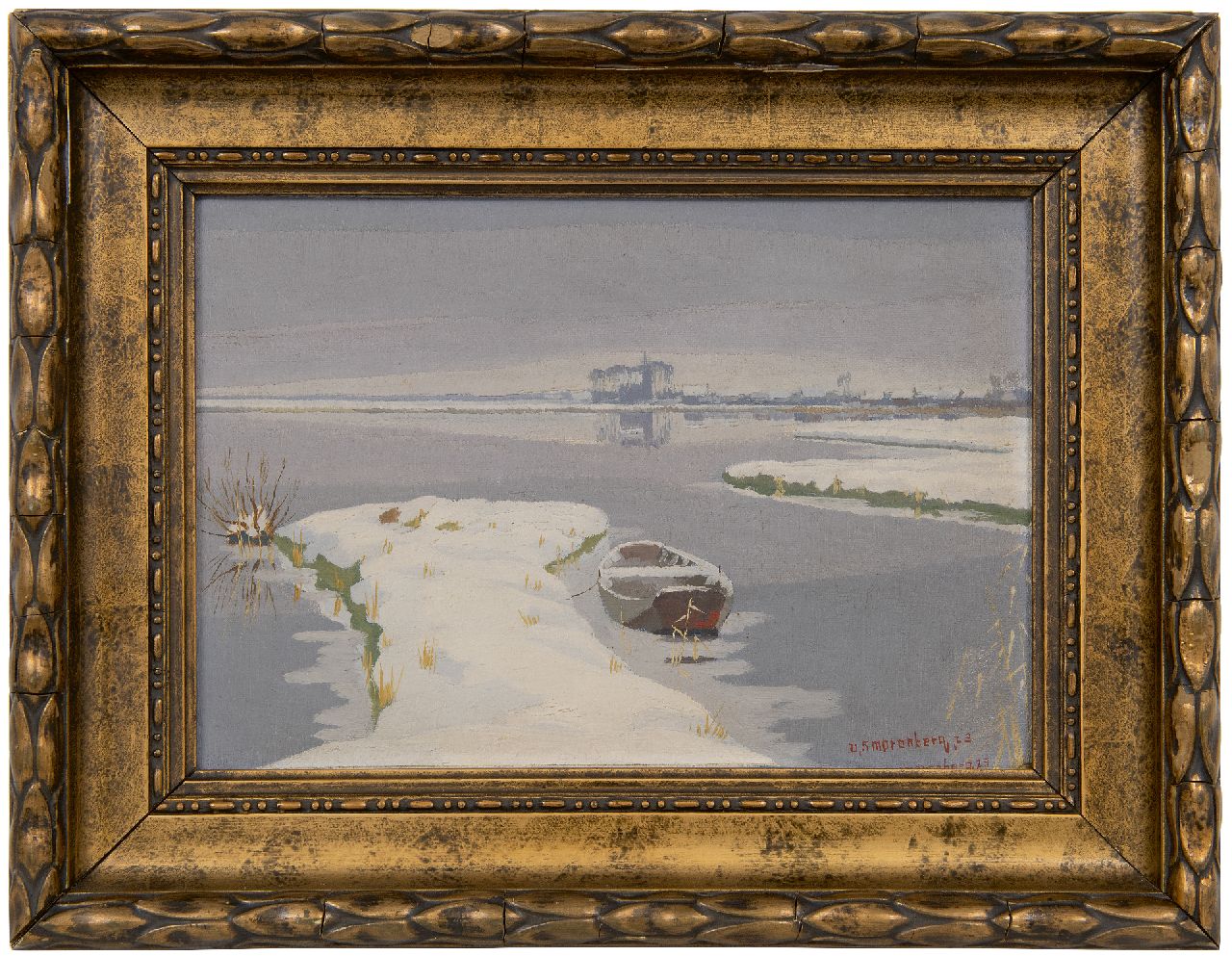 Dirk Smorenberg kunstwerk • schilderij • te koop Winters plasgezicht, in de verte het kerkje van Oud-Loosdrecht