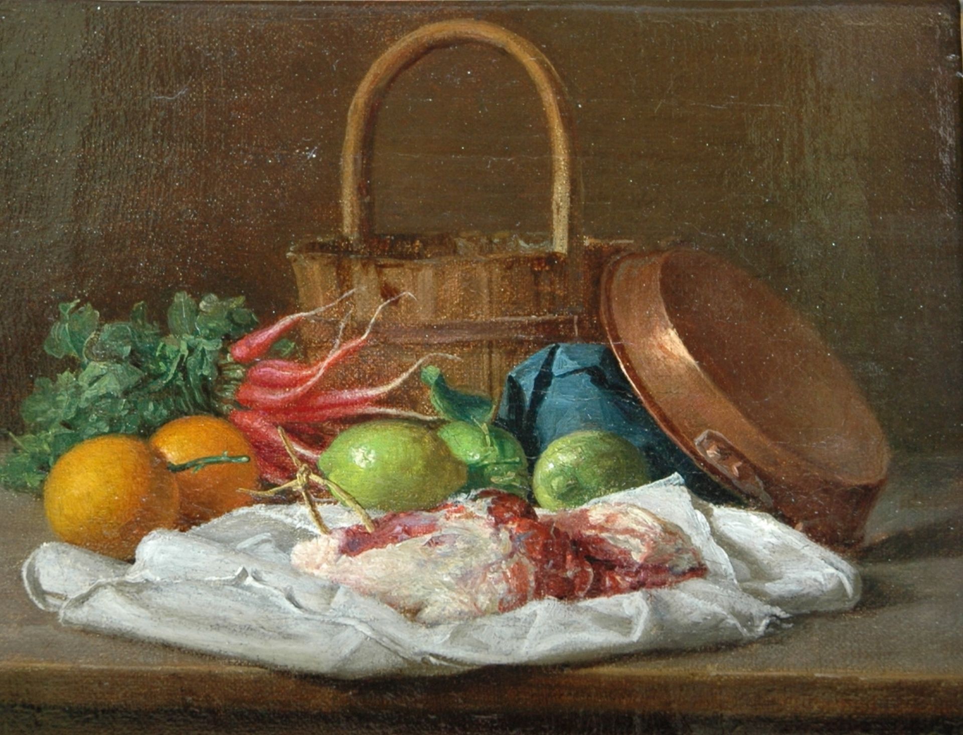 Duitse School, 19 eeuw kunstwerk • schilderij • voorheen te koop Stilleven met radijs en vlees