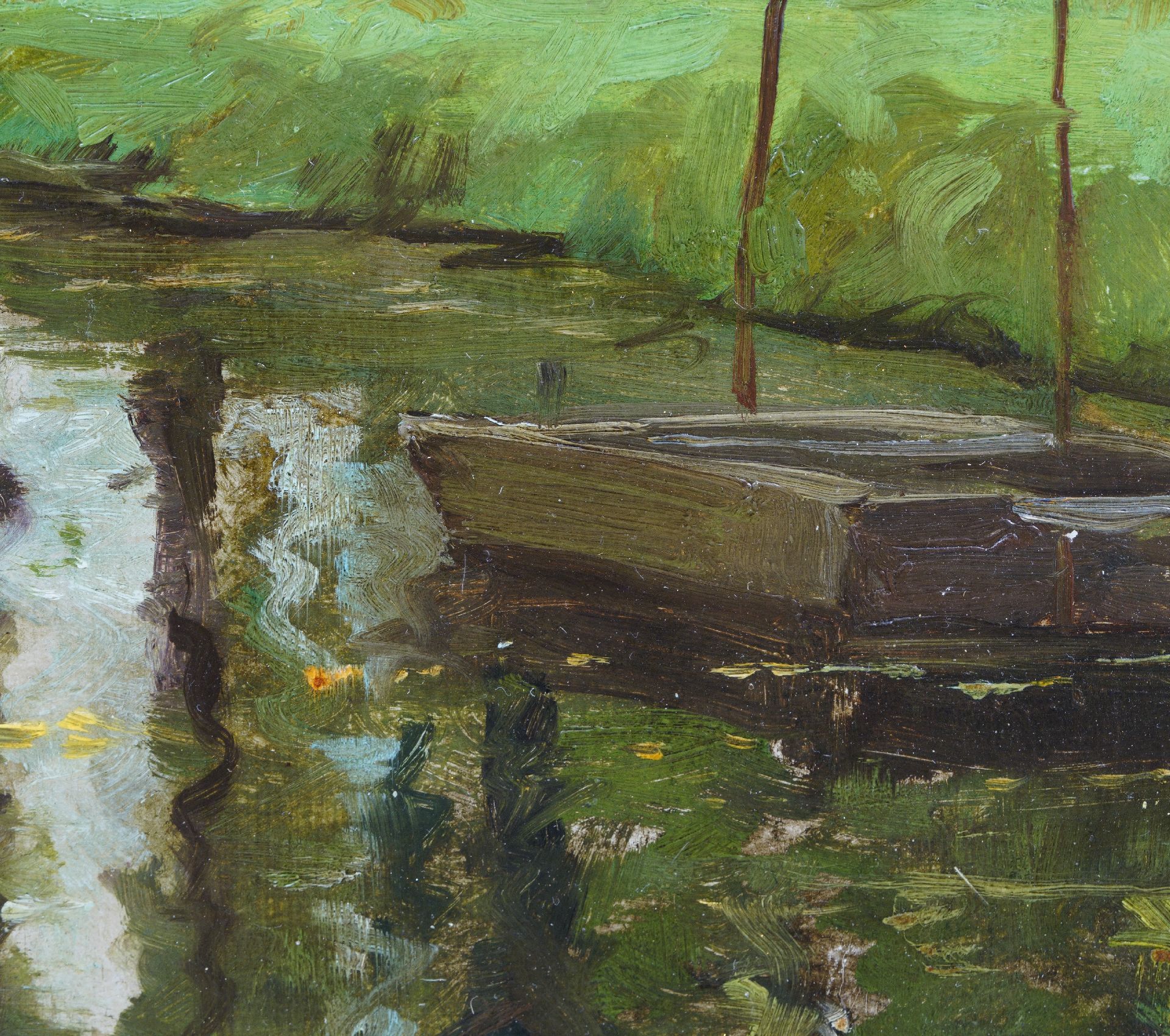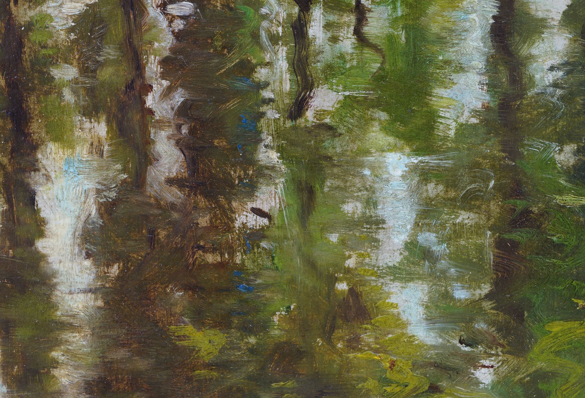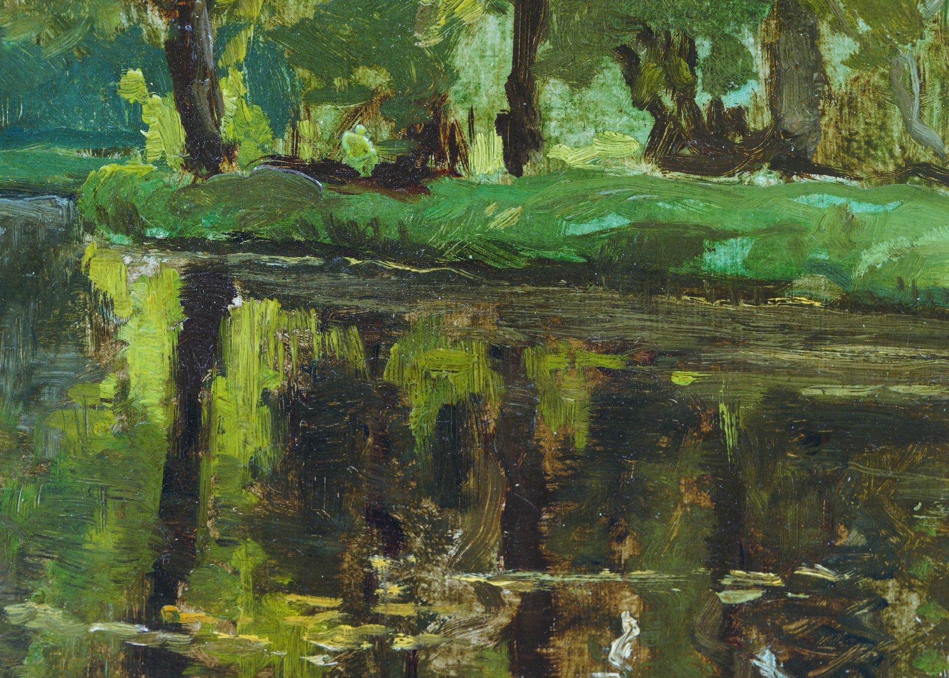 Eduard Becht was leerling van de succesvolle Haagse schilder Julius van de Sande Bakhuyzen, voor wie stemming en atmosfeer een grote rol speelden in het landschap. Bij Becht is dat niet minder belangrijk. Door in dit schilderij van het Haagse Bos de horizon heel hoog te plaatsen ligt er meer nadruk op de weerspiegeling in het water dan op de bomenpartij aan de oever. Het oeuvre van Becht omvat voornamelijk landschappen met bomen en duinlandschappen, zowel bij zomer als winter. Hij was ook een verwoed etser en vriend van de Haarlemse kunsthandelaar Johannes Hendrikus de Bois, voor wie hij zo nu en dan teksten schreef. Ook was hij kunstverslaggever van De Avondpost, waarin hij tentoonstellingen van tijdgenoten beschreef.