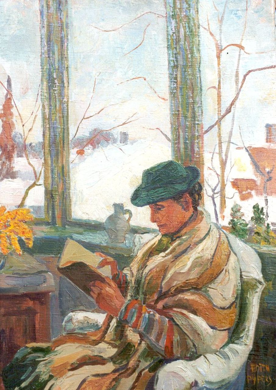 annotatie verso: 'Lezende figuur bij sneeuw. Edith Pijpers''