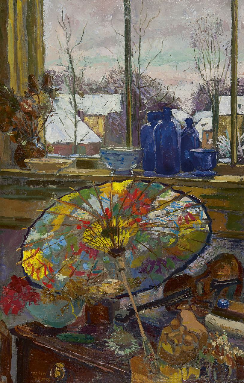 Edith Pijpers kunstwerk • schilderij • voorheen te koop Stilleven met parasol bij winters venster