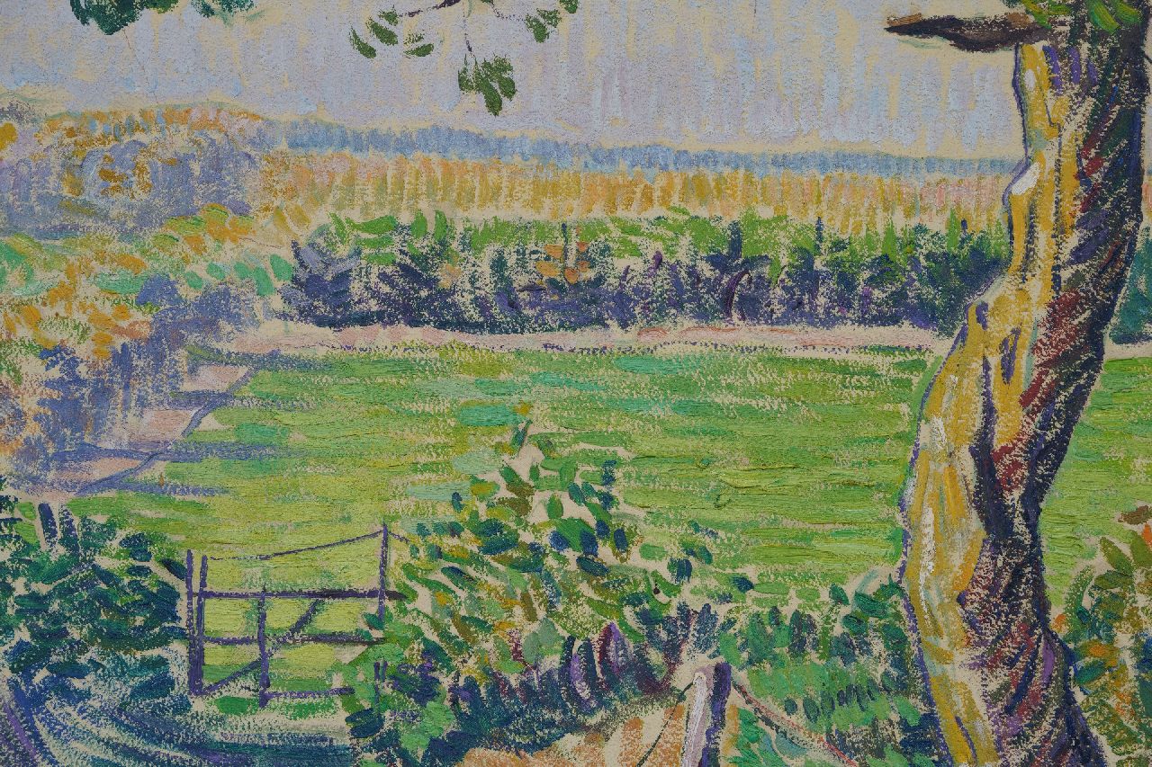 Edith Pijpers | Dorpskerkje tussen veld met korenschoven, olieverf op papier, 38,1 x 48,5 cm
