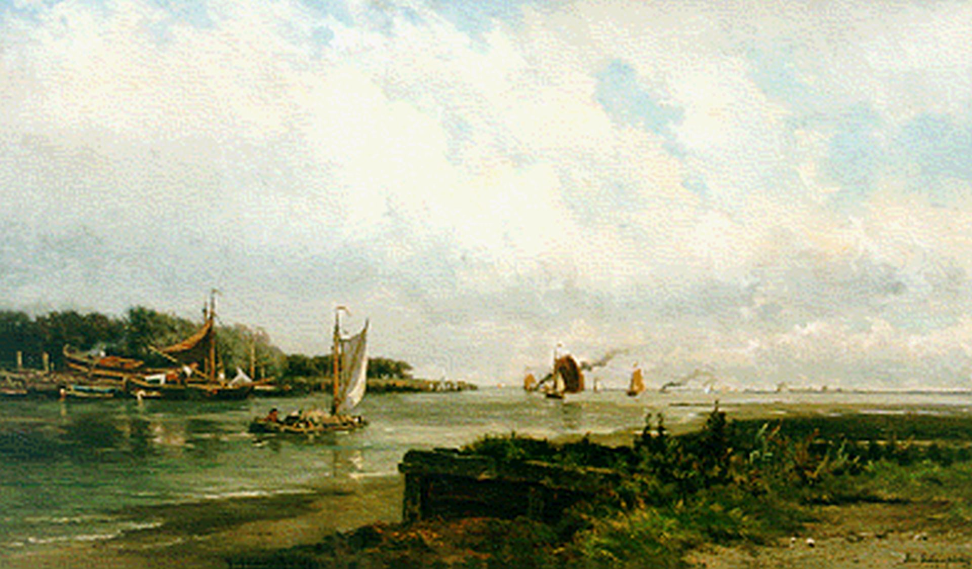 Edmund Schampheleer kunstwerk • schilderij • voorheen te koop Zomers riviergezicht met veel bedrijvigheid