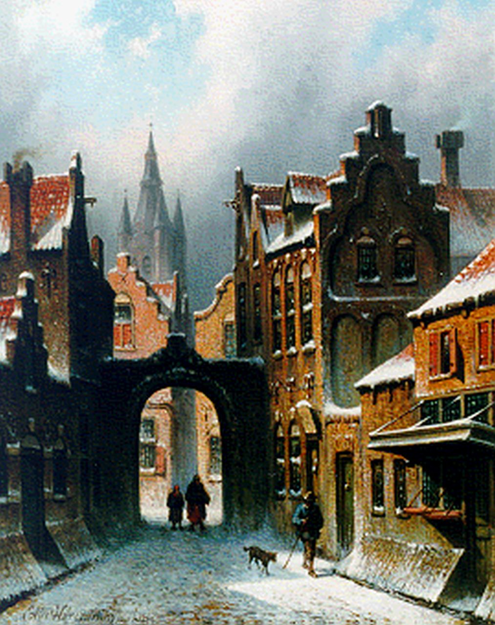 Eduard Alexander Hilverdink kunstwerk • schilderij • voorheen te koop Winters straatje te Delft, met de Oude Kerk op achtergrond