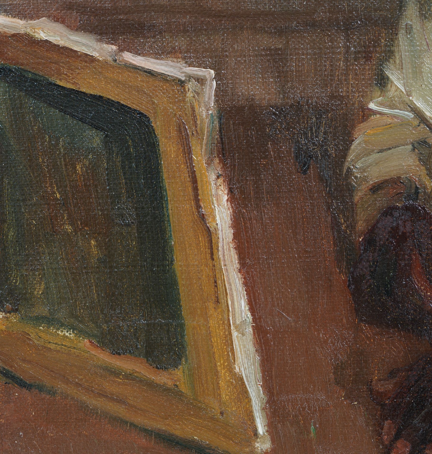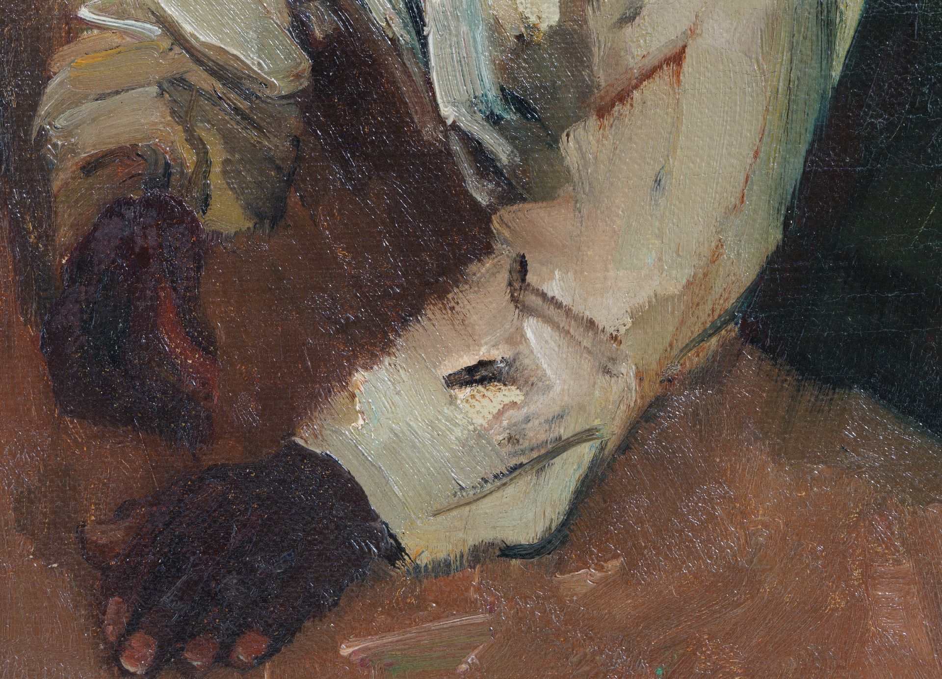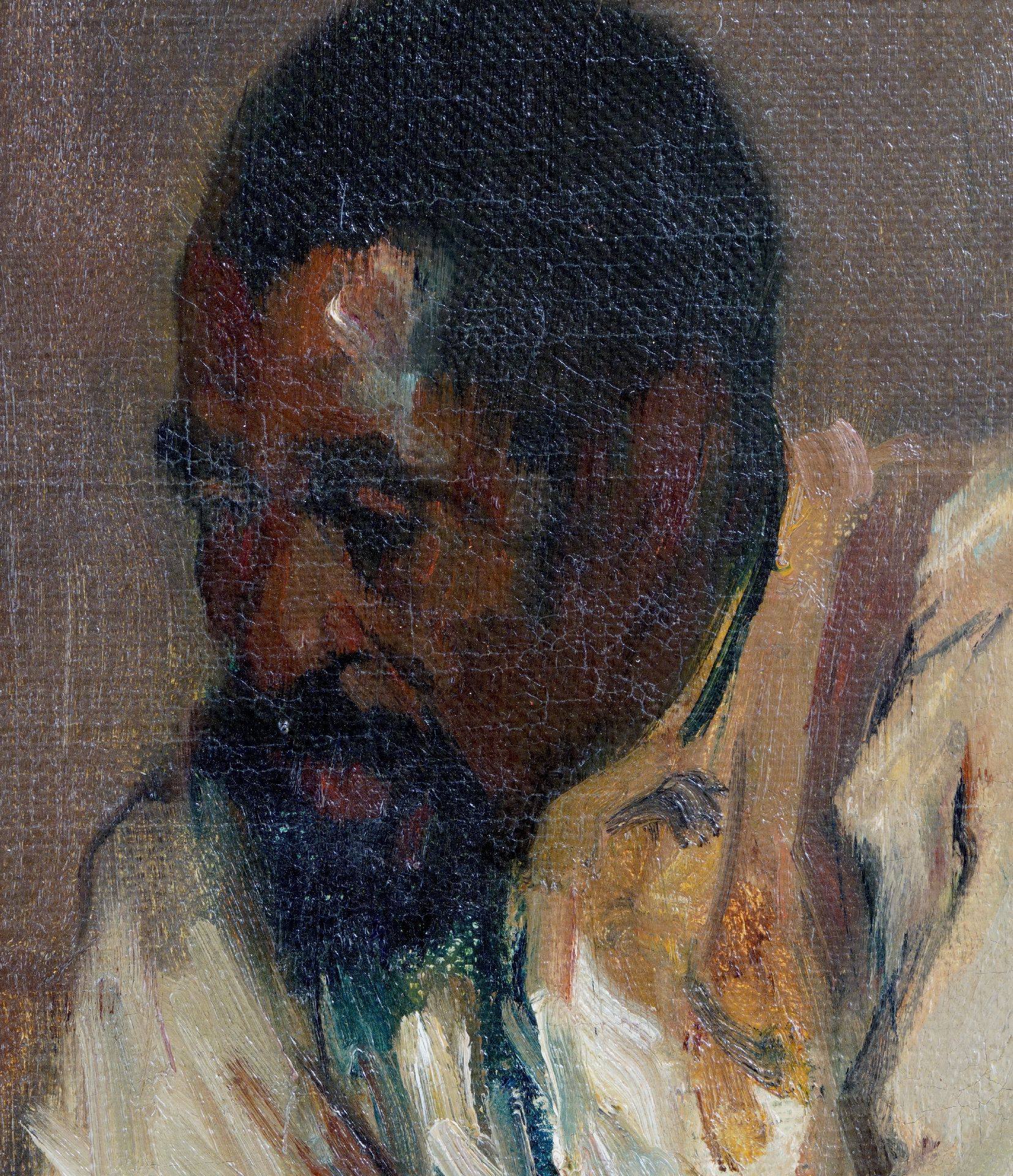 Eduard Frankfort wordt geen rabbijn zoals zijn Joodse vader in gedachten heeft. In plaats daarvan vertrekt hij naar het wereldse Amsterdam om daar aan de Rijksacademie te studeren. Aanvankelijk schildert hij bijbelverhalen en scènes uit het Joodse religieuze leven. Later zijn dat vooral genretaferelen en portretten in een donker kleurenpalet en met brede penseelstreken. Frankfort blijkt verknocht aan Amsterdam, ook na zijn studententijd blijft hij er wonen. Hij doet inspiratie op in het landelijke Drenthe en Het Gooi, maar ook in het buitenland. In 1905-1906 is hij enige maanden in Zuid-Afrika, waar hij vooral portretten maakt. Waarschijnlijk is dit portret er een van. Een zwarte man ligt in een ontspannen houding op de vloer. Liggend op zijn zij met opgetrokken knieën bekijkt hij aandachtig een schilderij. Frankfort heeft het misschien net af en vraagt om zijn mening? Hoe zou deze kunstliefhebber het beoordeeld hebben?