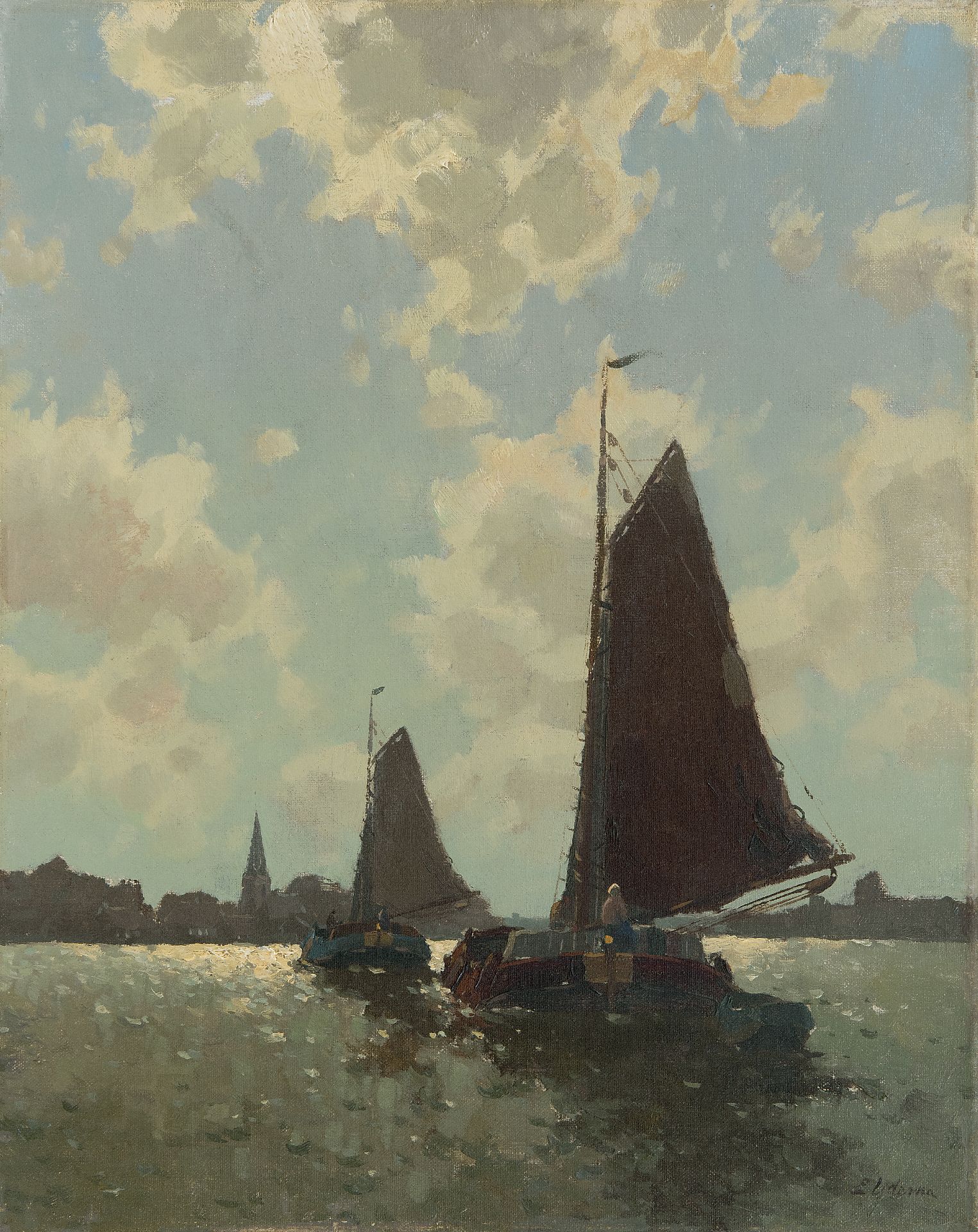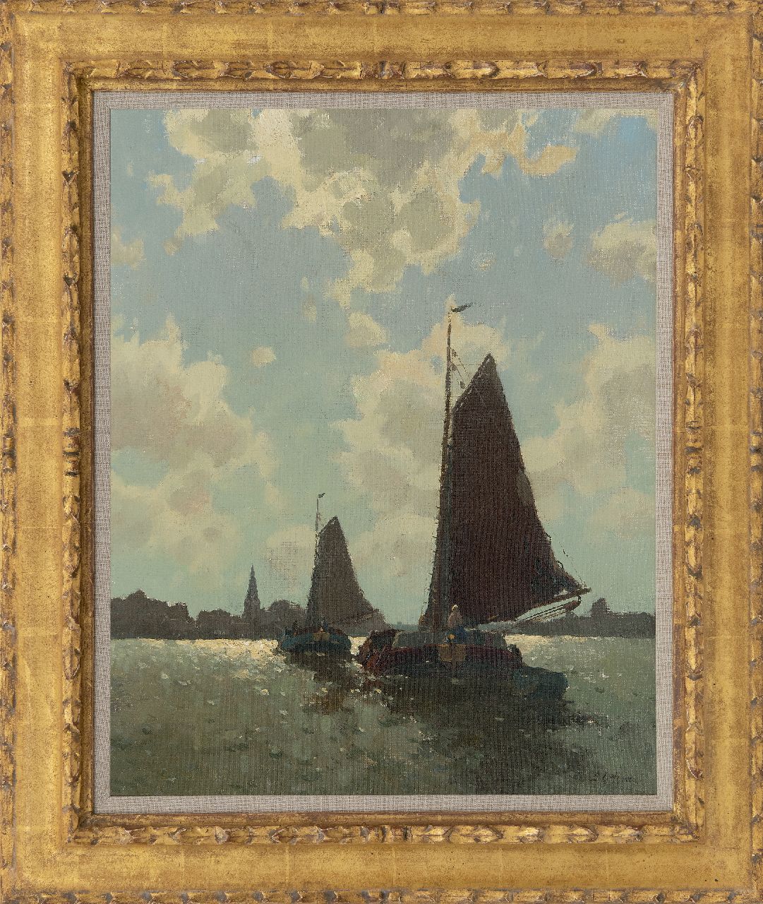 Egnatius Ydema kunstwerk • schilderij • voorheen te koop Twee tjalken varend bij tegenlicht, bij Eernewoude